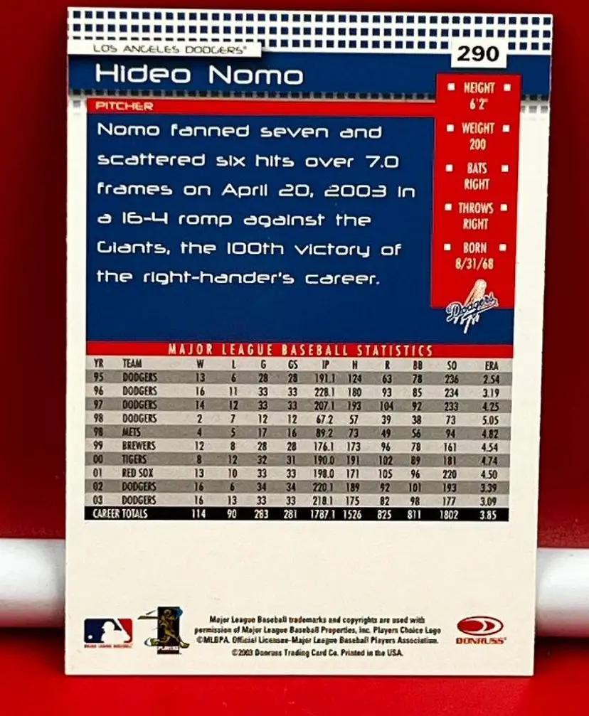 Hello, what we have is a Collector Trading Card by: Donruss. Year: 2004. Team: Dodgers. Player: Hideo Nomo. Number: 290.