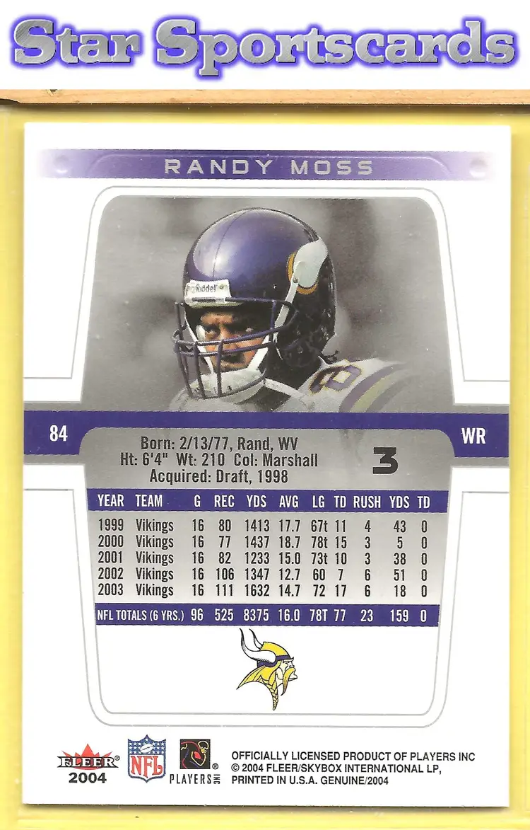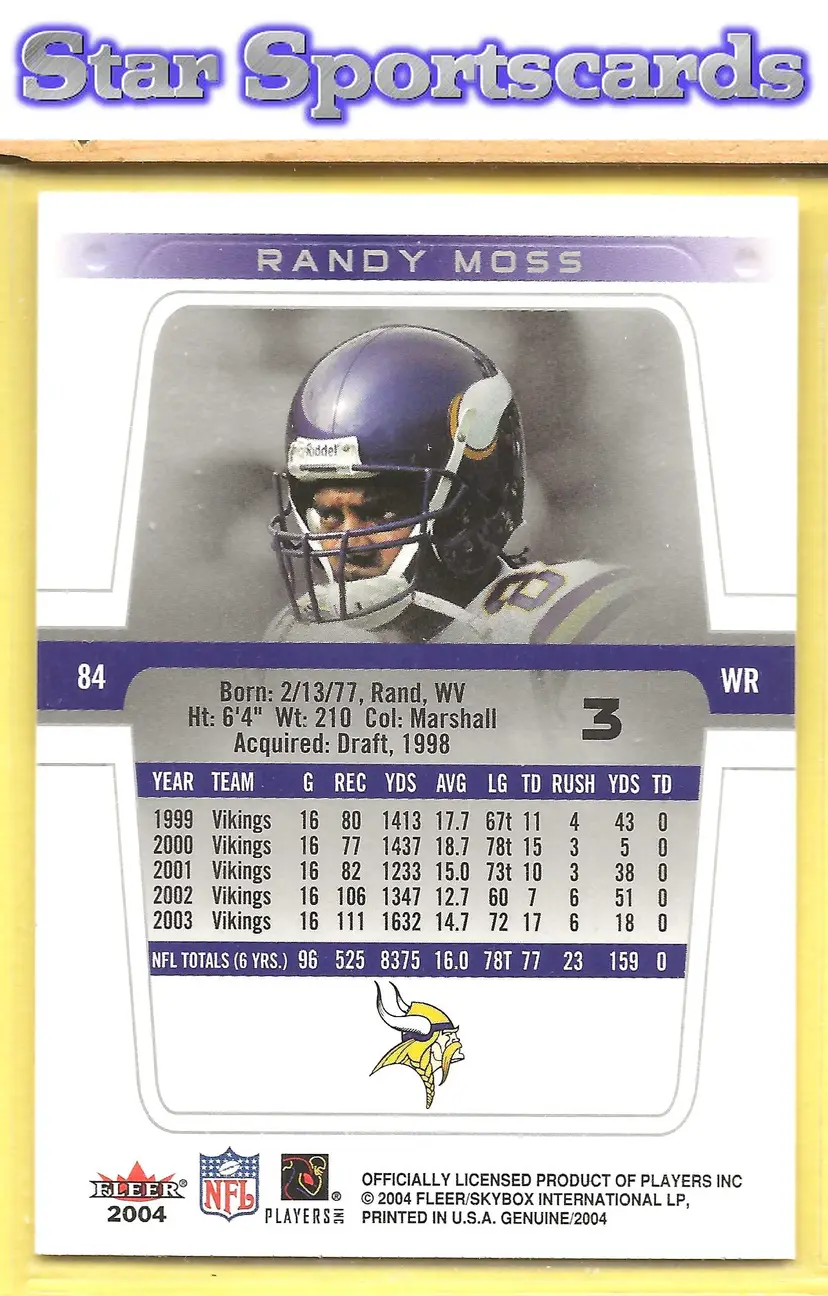 This is a nice example of a 2004 Fleer Genuine #3 Randy Moss .Other important information about this card: In Randy Moss played for the Minnesota Vikings.Please check out our other listings for more great cards.