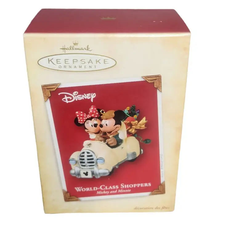 Celebrate the holiday season with this 2004 Hallmark Keepsake Ornament featuring Disney's beloved characters, Mickey and Minnie, as world-class shoppers. This beautifully crafted ornament is a must-have for any Disney lover and collector. The attention to detail and quality craftsmanship make it a timeless piece that can be cherished for years to come. Not only is this ornament perfect for decorating your tree, it also makes a great gift for family and friends. The brand, Hallmark, has a reputation for creating high-quality ornaments, and this one is no exception. Don't miss out on the chance to add this stunning Disney-themed ornament to your collection. • Wheels turn and packages move when touched. Die-cast metal and handcrafted • Features Disney's Mickey & Minnie • Size Approx 5" W • Great for collectors • Artist Nello Williams New in Original Box
