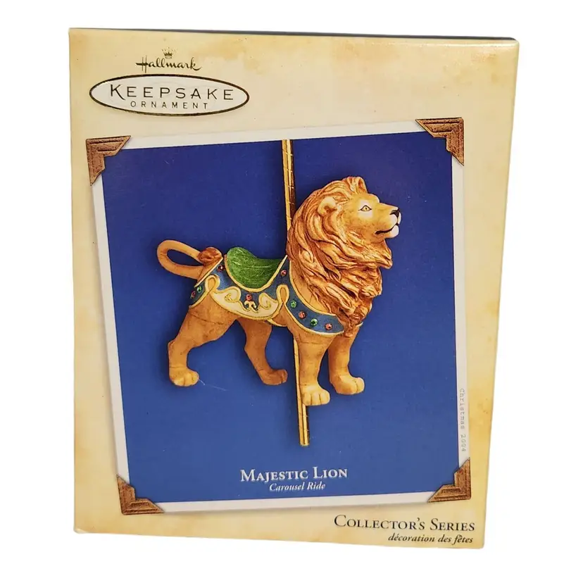 Celebrate the magic of the holidays with the 2004 Hallmark Majestic Lion Carousel Ride Keepsake Ornament. Featuring intricate details and a timeless design, this ornament is perfect for collectors and holiday enthusiasts alike. First in the Hallmark Ornament Carousel Ride series is the Majestic Lion. He leads this five year series that recreates the elaborate carousel animals master woodcarvers once took great pride in creating. This Hallmark ornament is handcrafted and metal. • Hallmark Keepsake Ornament • Majestic Lion Carousel design • Size Approx 6" H • Artist Kristina Kline New in the original Box.