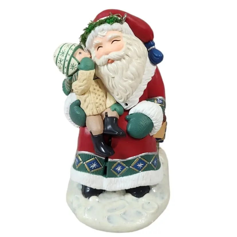 Capture the magic of Christmas with the 2004 Hallmark Keepsake Ornament "Sittin' on Santa's Lap." Record a child's Christmas wish - requires LR44 batteries (not included). Play back a whole conversation between Santa and the child. Message can be up to 12 seconds long. Note: the recording is permanently stored until it is recorded over. Removal of batteries will not affect recording. To capture the treasured memory of your child sitting on Santa's lap record your child saying the gifts he or she wold like to receive and then hit the playback button to hear: " (Santa's voice) "Hello, little one. And what would you like for Christmas?" (Your child's answer will be inserted here) (Santa's voice) "Well, we'll see what we can do. Be good now!" • Features Santa Claus • Size Approx 4" H • Unique and nostalgic • Artist Tammy Haddix New in original box, opened for pictures.