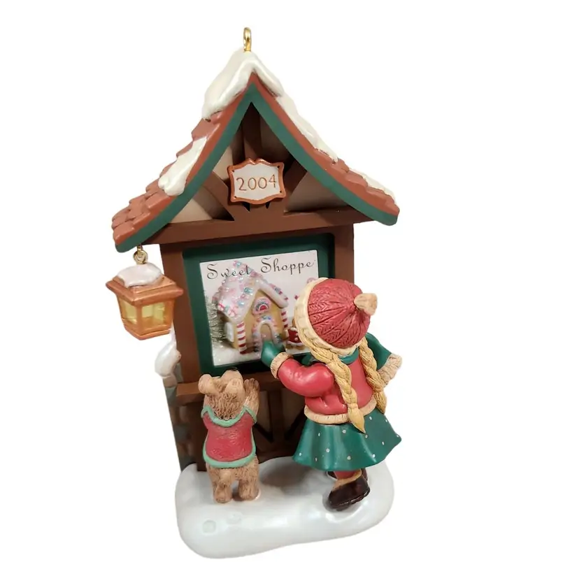 This charming ornament captures the essence of holiday nostalgia with intricate detailing of a little girl and her dog admiring a sweet shop display. Featuring a snowy roof, gingerbread house, and festive lantern, it evokes the joy of seasonal traditions and creates a picturesque addition to your holiday decor. Keepsake Ornament Club