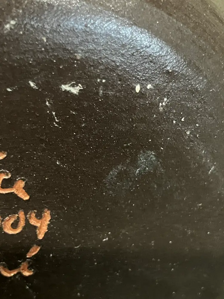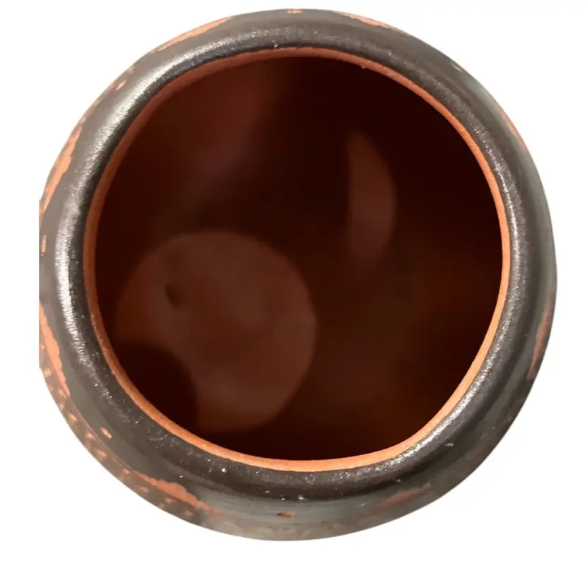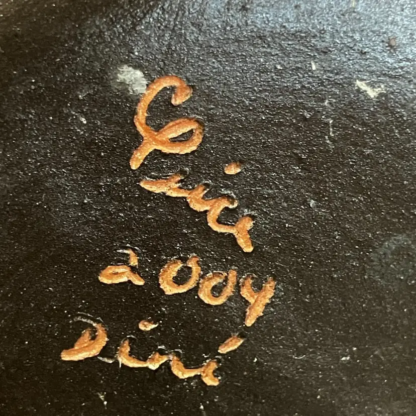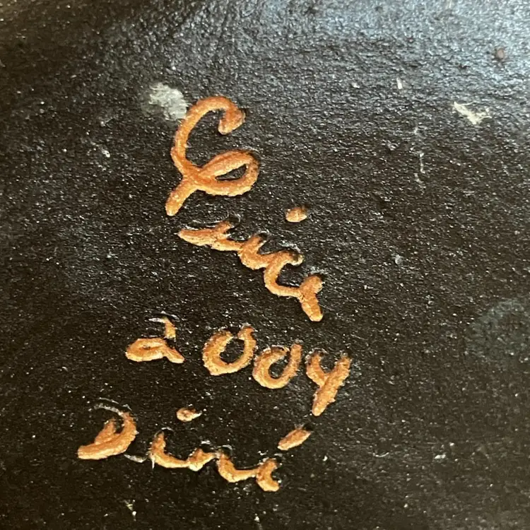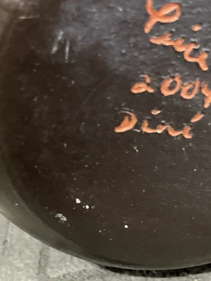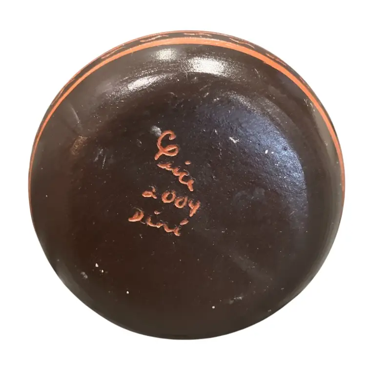 Smaller pot measuring 3.75” tall. Not sure of artist’s name? Has a few white scuffs around outside and bottom. No chips or cracks. Please see all photos for condition thank you.