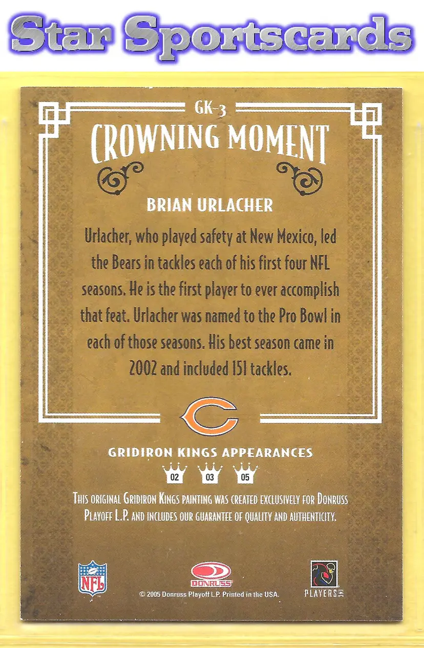This is a nice example of a 2005 Donruss Throwback Threads #GK-3 Brian Urlacher Gridiron Kings Framed Red .Other important information about this card: In Brian Urlacher played for the Chicago Bears.Please check out our other listings for more great cards.