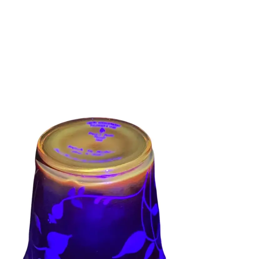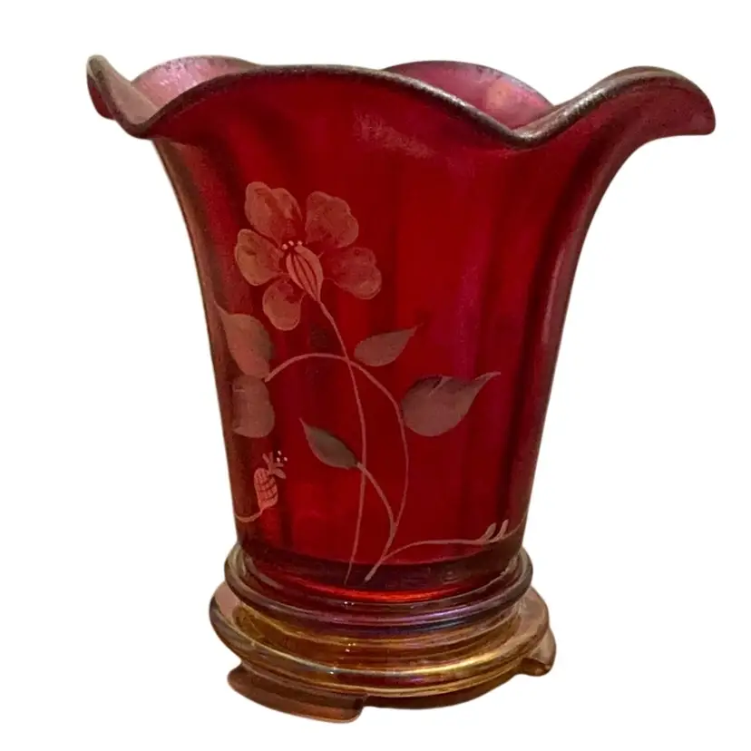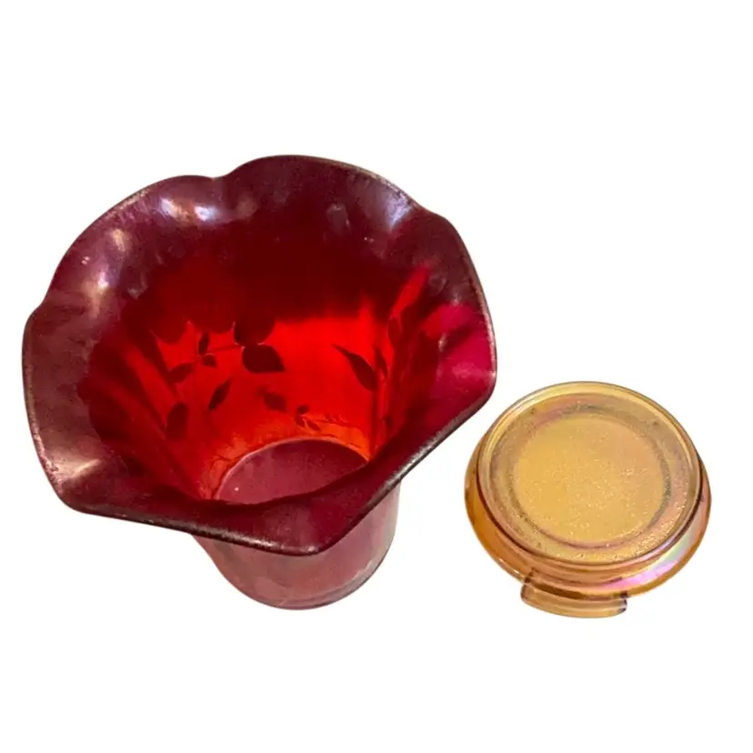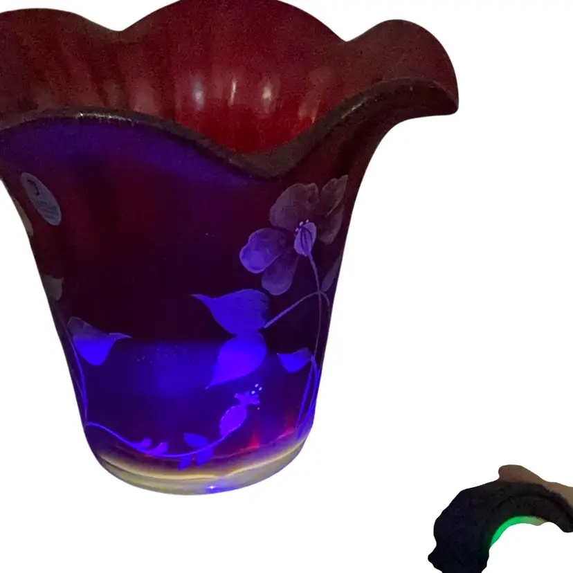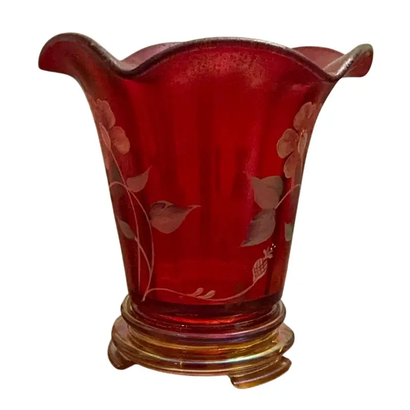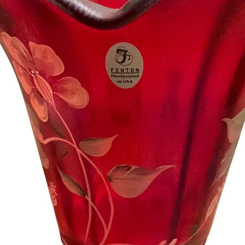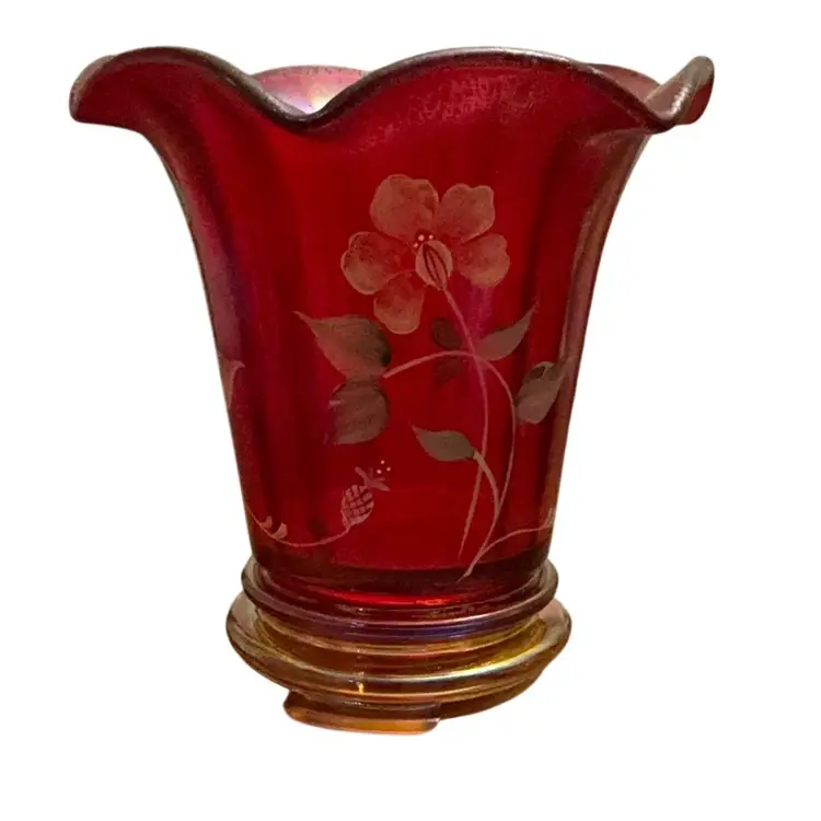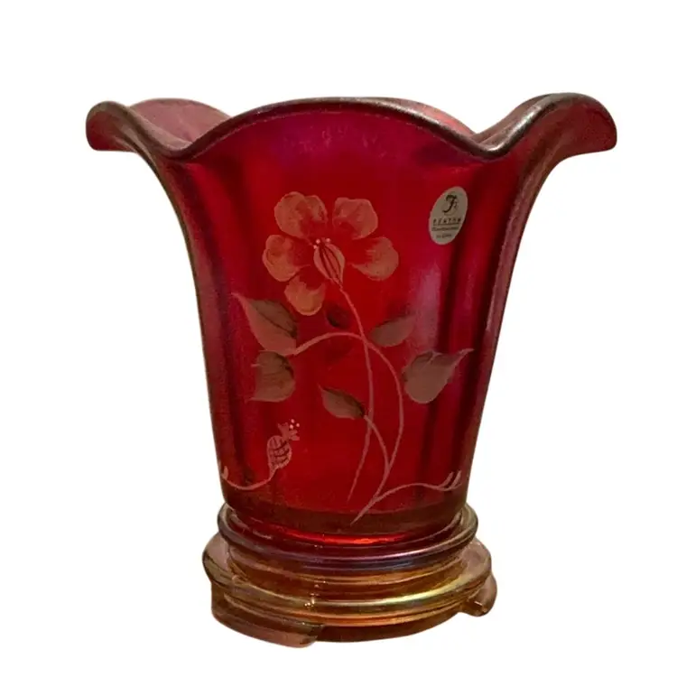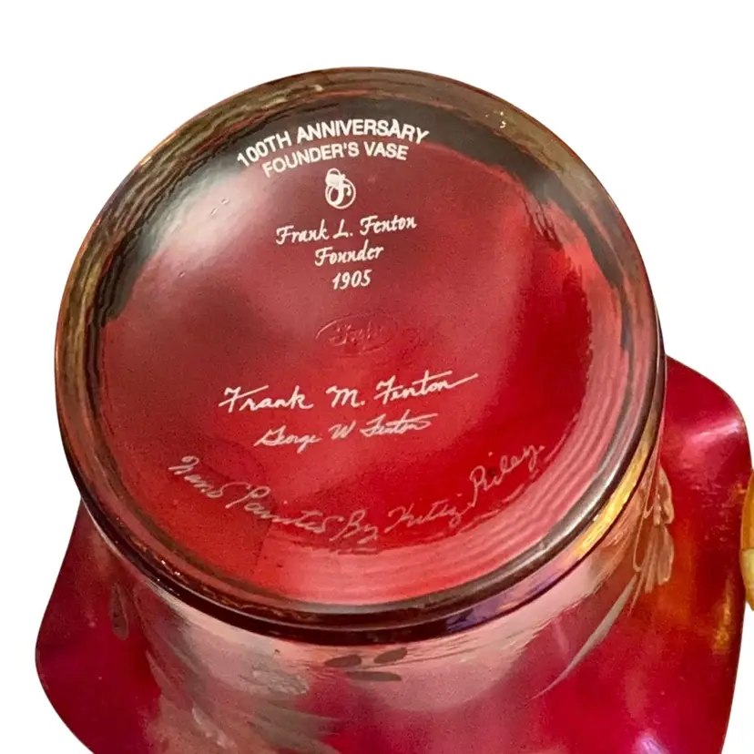 Stunning glower on the base of the vase. This stretch flip vase bear not only the artist signature but the founder of the company, Frank Fenton and his son George. The original Fenton sticker is attached and the Fenton logo is stamped on the base of the vase. The vase stand is an amber carnival glass.