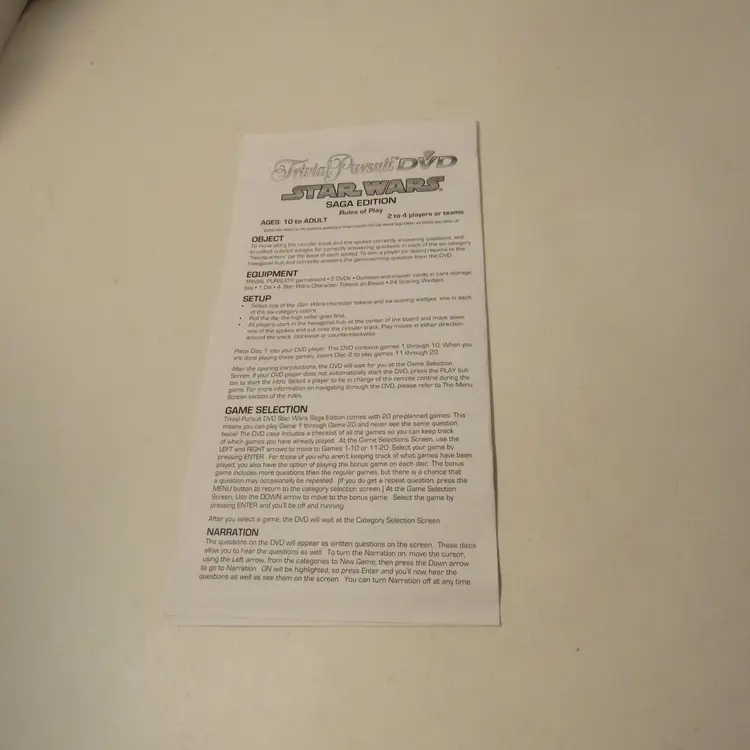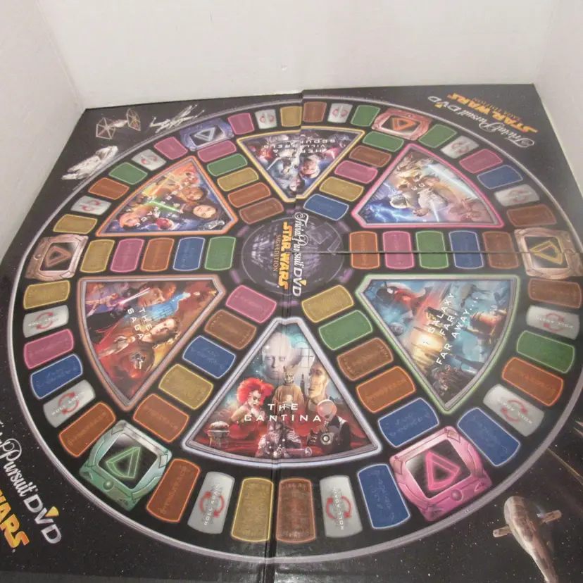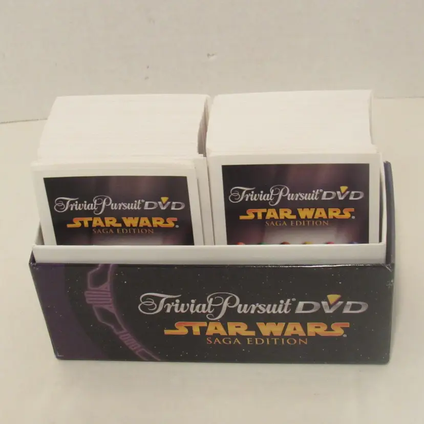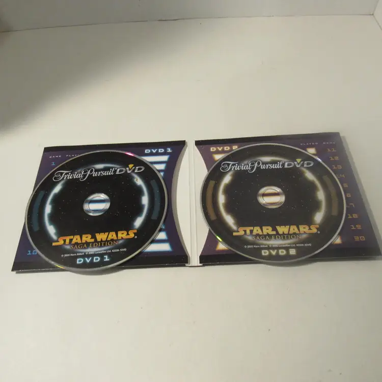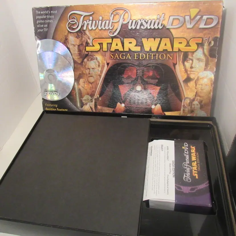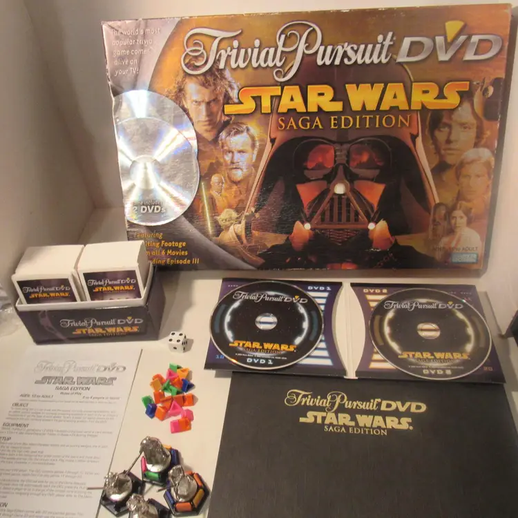 *Pre-owned - Collectible - Circa @ 2005 *The game consists of 2 DVDs, game board, instructions, Questions/Answers cards in card storage box, 1 DIE, 4 Star Wars characters, and 20 scoring wedges.