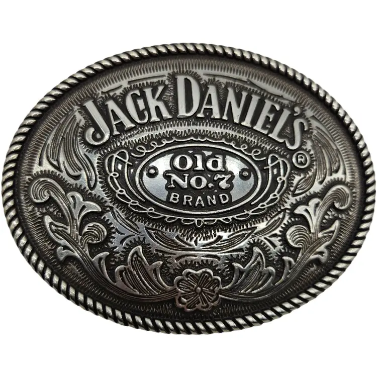 Jack Daniel's Old No. 7 Brand oval belt buckle in silver-tone metal with a rope edge and filigree engraving.