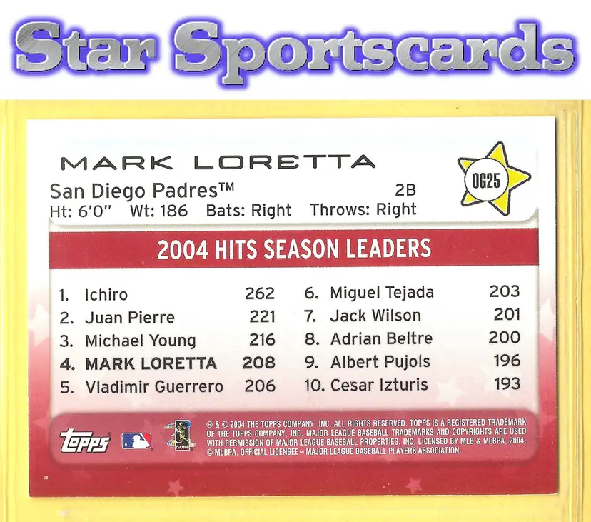 This is a nice example of a 2005 Topps #OG25 Mark Loretta Own The Game .Other important information about this card: In Mark Loretta played for the San Diego Padres.Please check out our other listings for more great cards.