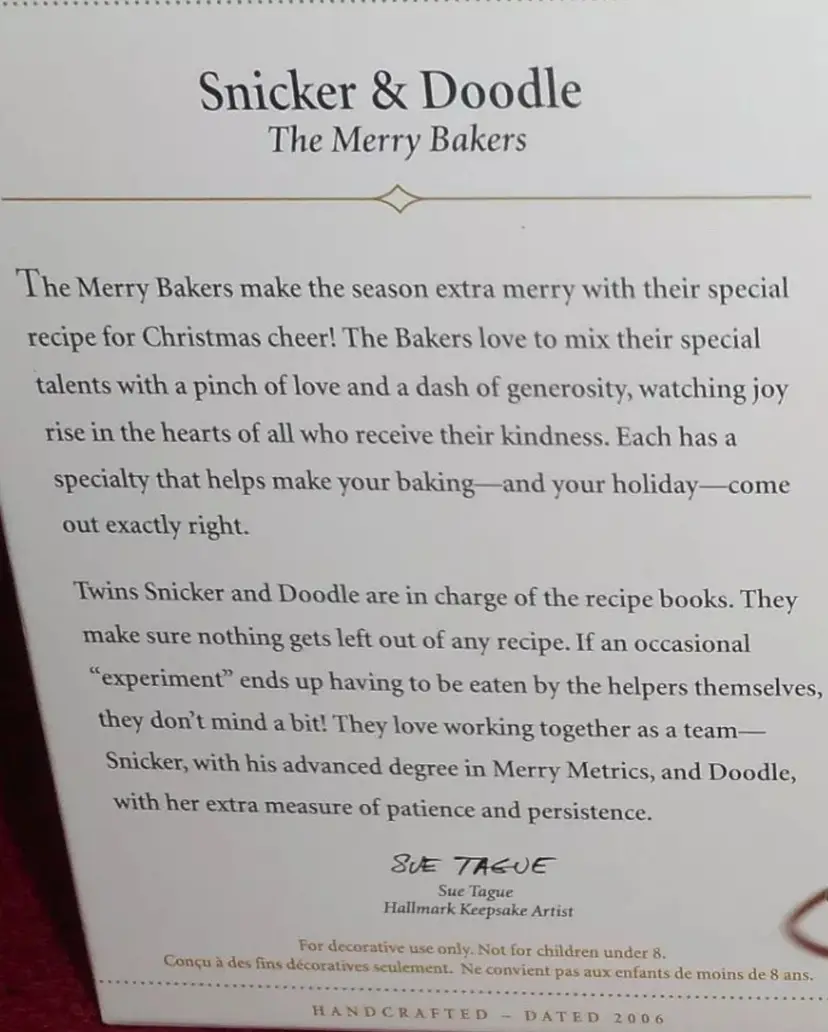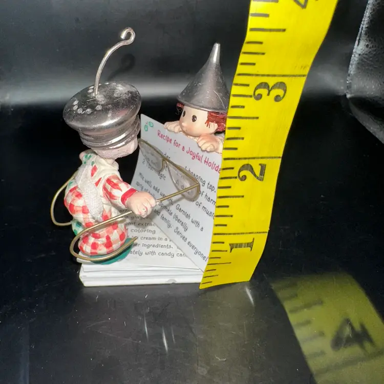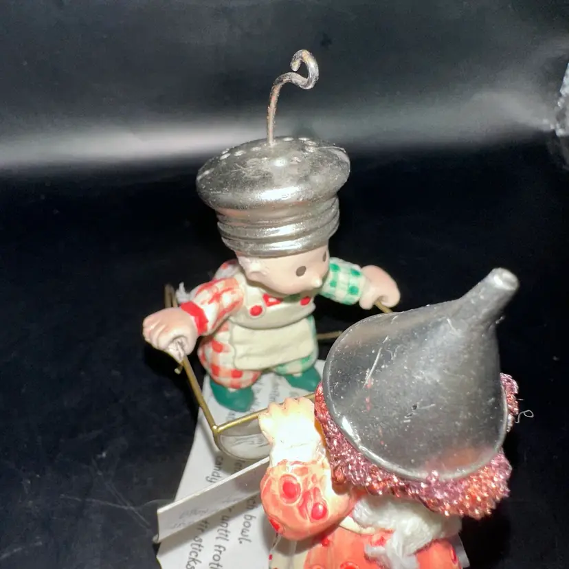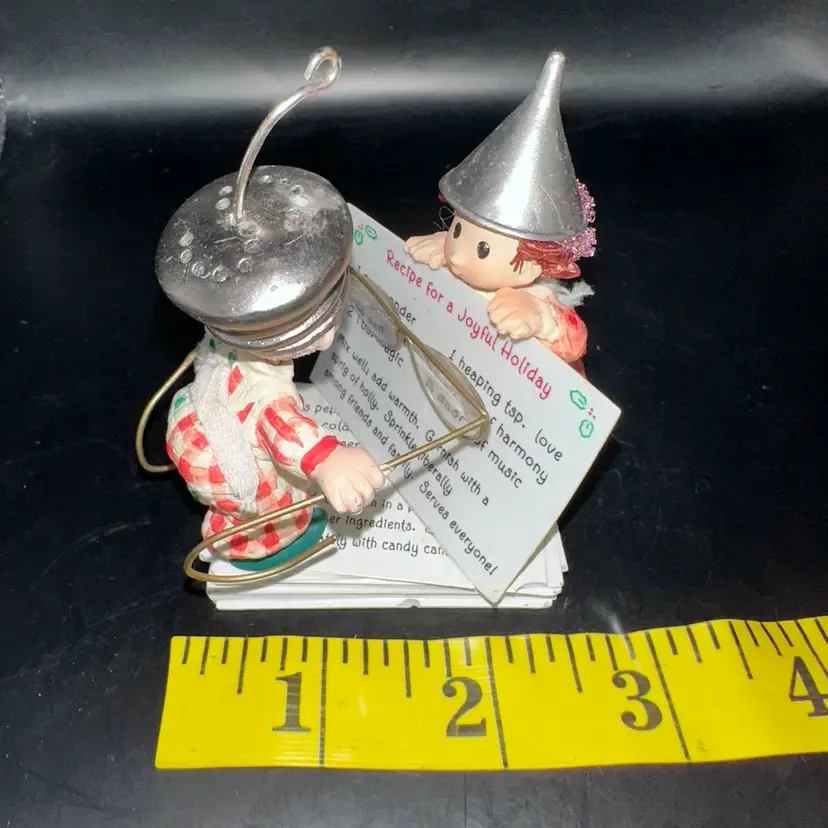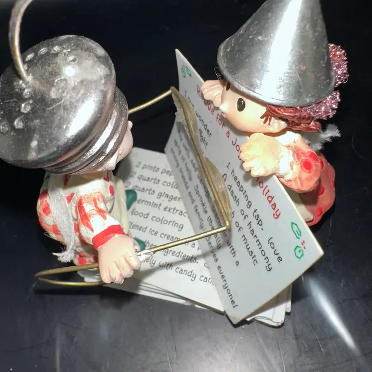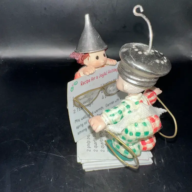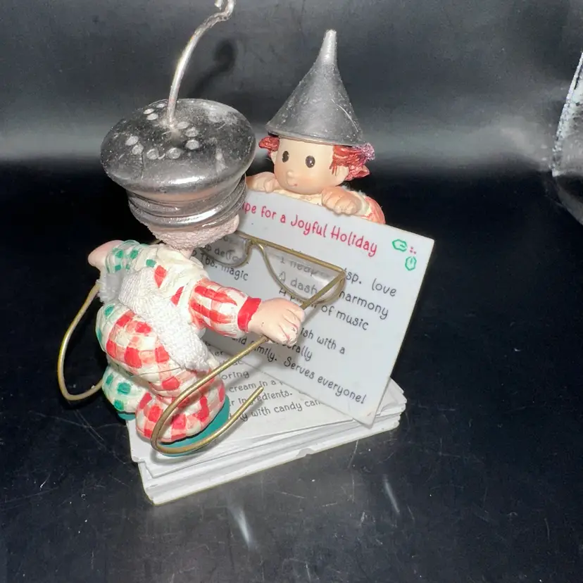 2006 Hallmark Keepsake Ornament Snicker & Doodle The Merry Bakers No Box. The Keepsake Ornament depicts two children, a boy and a girl, dressed in red and green checkered outfits, wearing repurposed metal lids as hat and holding a recipe card and glasses. Adorable Collectors Piece For A Baker Or Chef. Does NOT come in Original Box. Box Pictures Included For Ornament Information Only. Smoke Free Home. #hallmark #keepsakeornament #snickeranddoodle #baking #chef