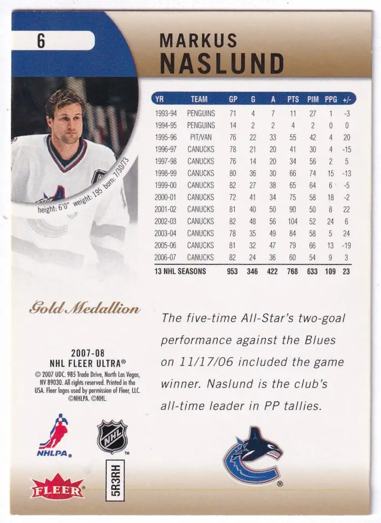 2007-08 Ultra Gold Medallion #6 Markus Naslund Vancouver Canucks