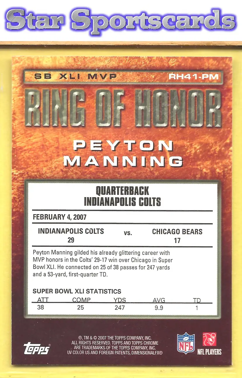 This is a nice example of a 2007 Topps Chrome #RH41-PM Peyton Manning .Other important information about this card: In Peyton Manning played for the Indianapolis Colts.Please check out our other listings for more great cards.