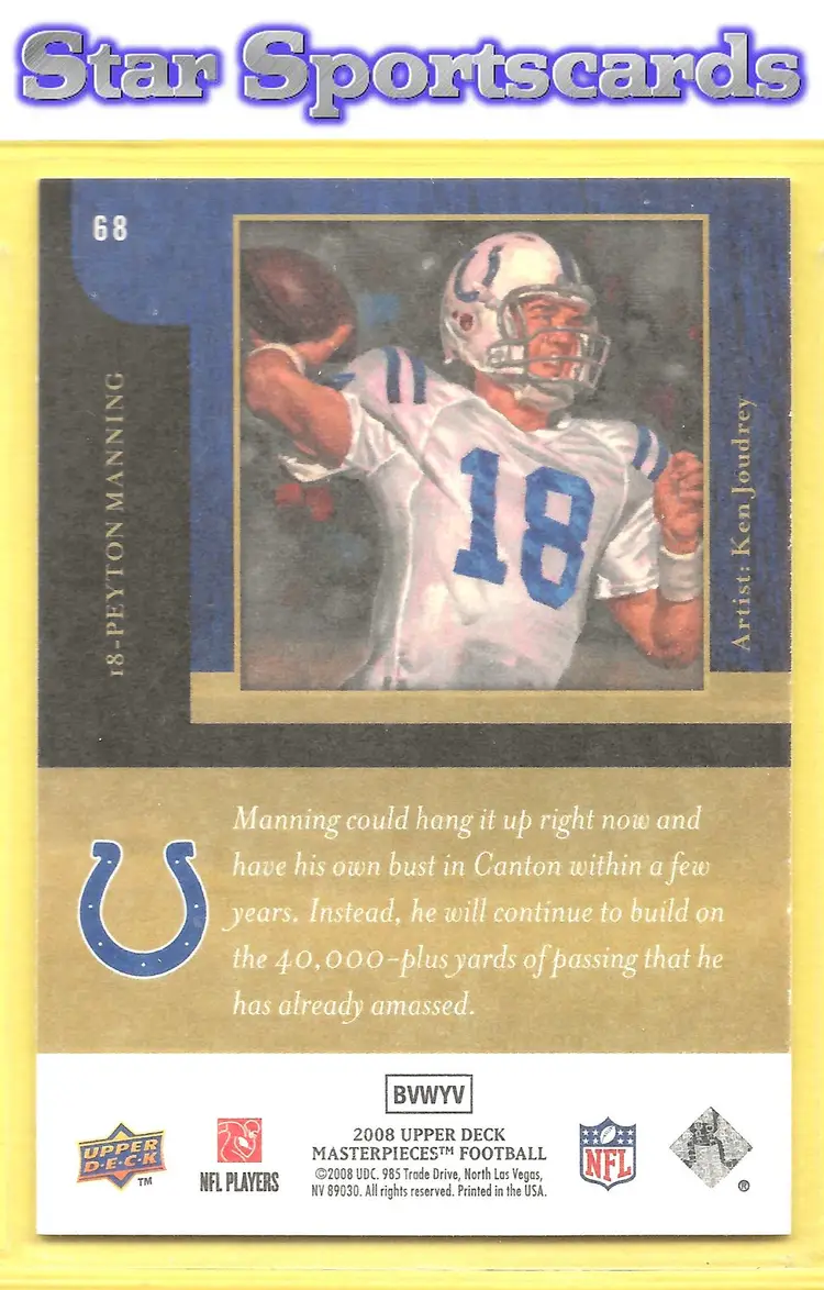 This is a nice example of a 2008 Upper Deck Masterpieces #68 Peyton Manning .Other important information about this card: In Peyton Manning played for the Indianapolis Colts.Please check out our other listings for more great cards.