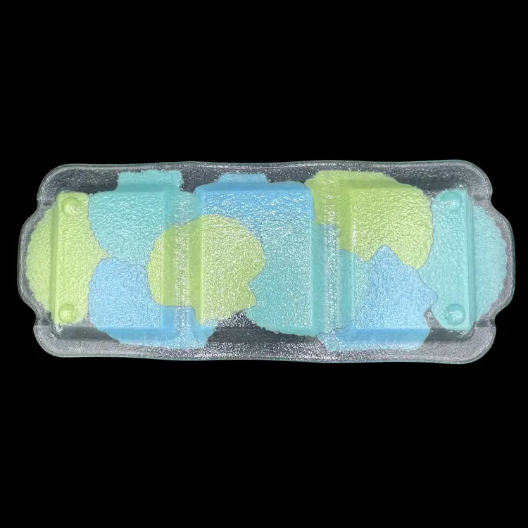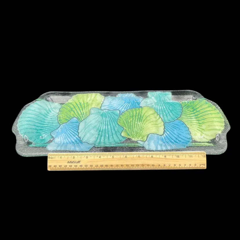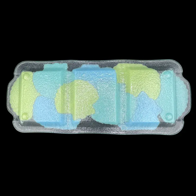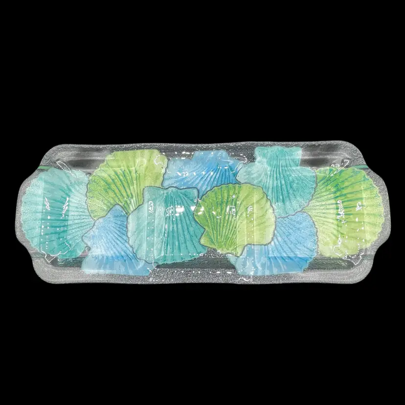 The 2009 Peggy Karr Glass Blue and Green Seashell Three Compartment Platter is a beautiful and unique serving platter made of fused glass. With a pattern of all-over seashells in blue and green, this rectangle-shaped platter is perfect for all occasions. Manufactured in 2009 by Peggy Karr Glass in the United States, this collectible piece brings a touch of style and elegance to any table setting.