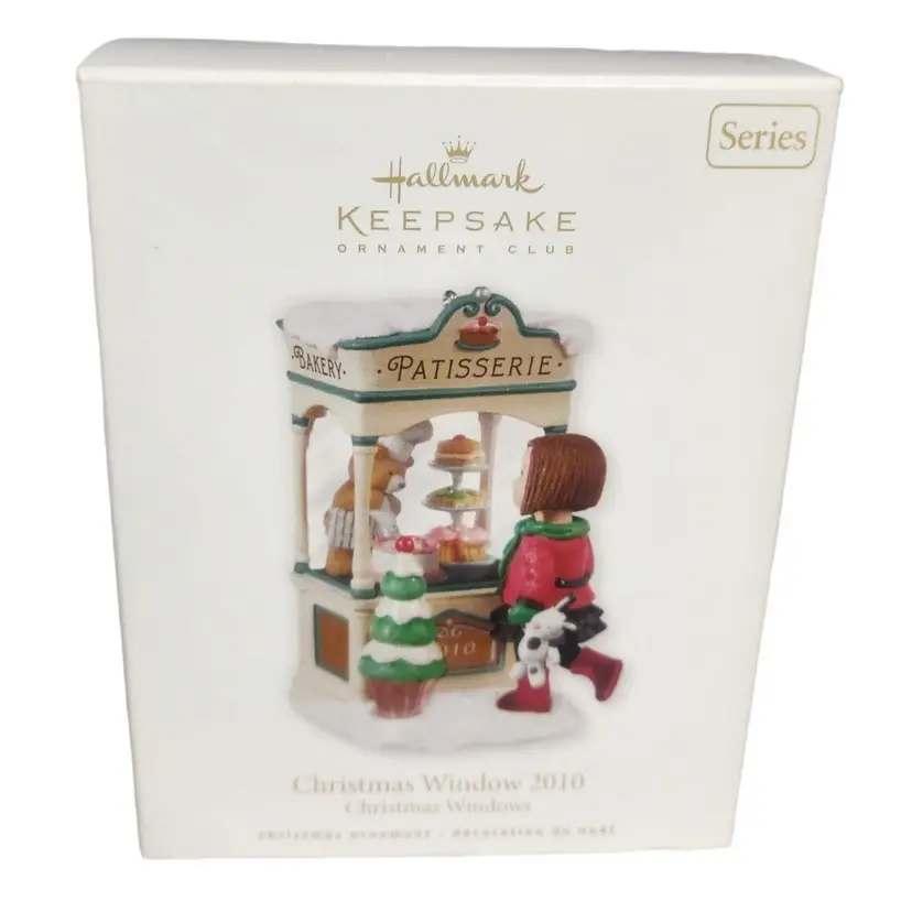 Celebrate the artistry and charm of the Christmas Window 2010 ornament from the Hallmark Keepsake series. This delightful ornament showcases a cozy winter bakery scene featuring a patisserie with dazzling details, including a cheerful baker and a young patron admiring the sweets. Handcrafted in 2010, this piece is the 8th in the Christmas Windows collection and a Club Exclusive. The detailed paintwork captures a nostalgic winter moment, making it a cherished collector's item or holiday decoration. • Club exclusive ornament • Features detailed winter bakery scene • Eighth in the Christmas Windows series New in the original box. Original box has minor wear due to storage.