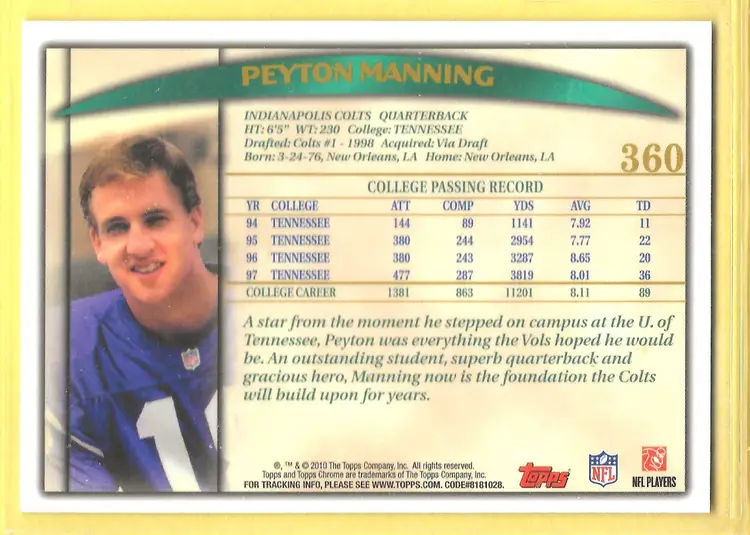 This is a nice example of a 2010 Topps Chrome #360 Peyton Manning Anniversary Reprints .Other important information about this card: In Peyton Manning played for the Indianapolis Colts.Please check out our other listings for more great cards.