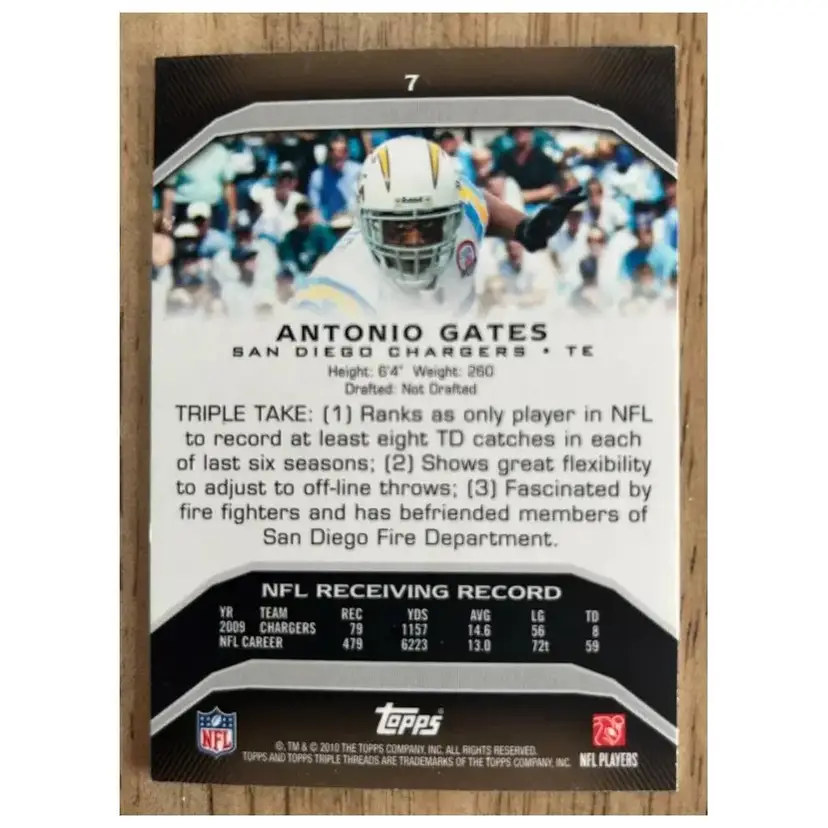 This is a 2010 Topps Triple Threads football card featuring Antonio Gates of the San Diego Chargers. It is serial numbered 374/499 and is an original card from Topps Co. The card belongs to the modern period and is a single card in near mint/mint condition.