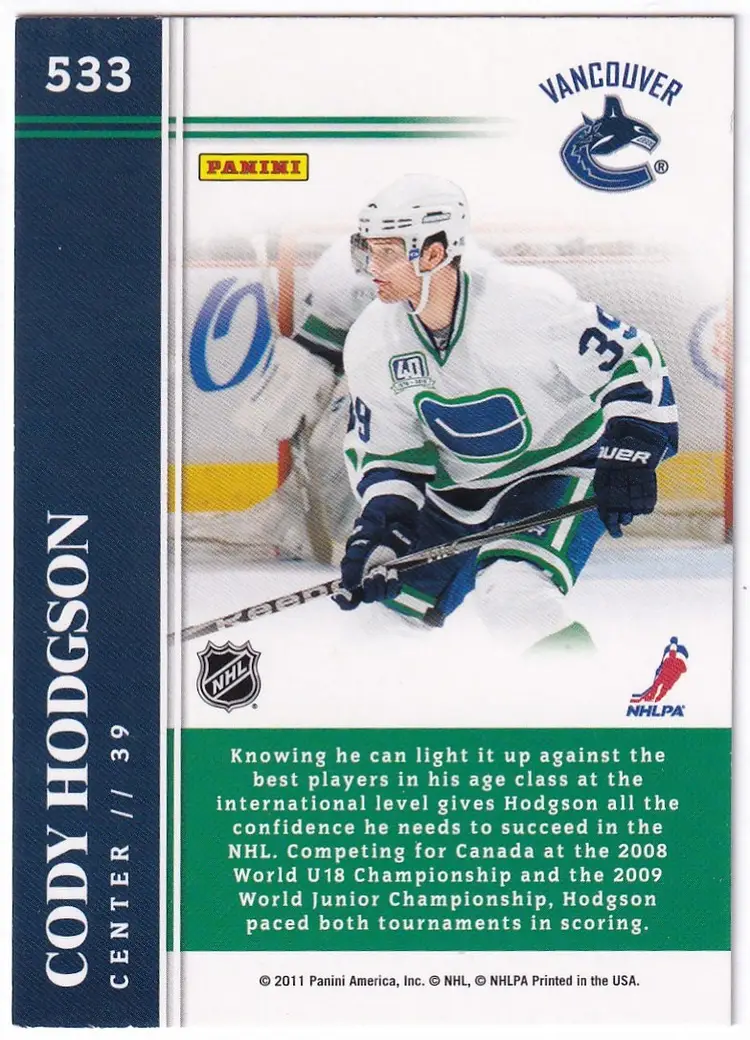 2011-12 Score #533 Cody Hodgson HR RC Vancouver Canucks