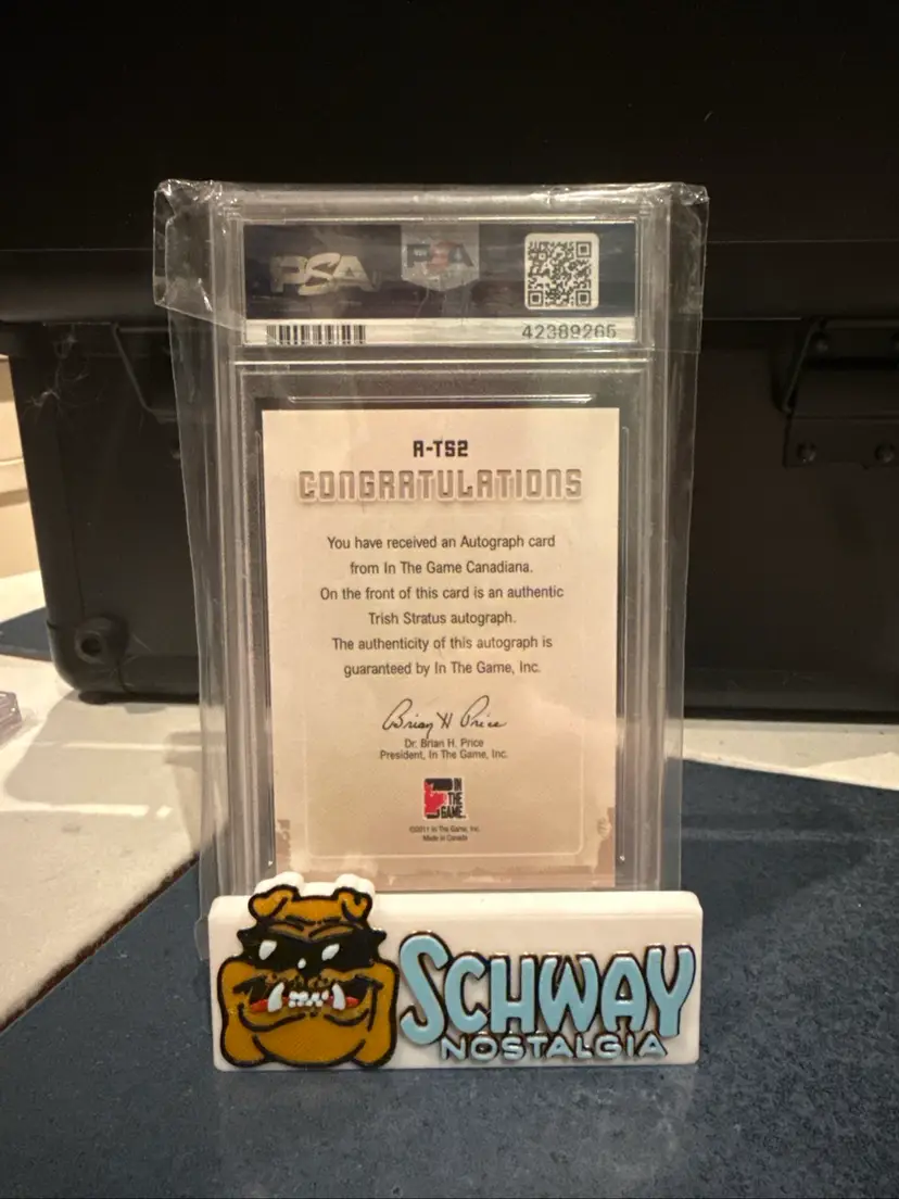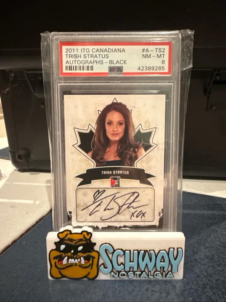 The product is a 2011 In the Game Canadiana trading card featuring the wrestler Trish Stratus. This autographed card is from the "Autographs" insert set and is a Black parallel variety. The card is graded as a PSA 8, indicating it is in good condition for collectors. By adding this rare and unique card to their wrestling trading card collection, fans can celebrate the Canadian wrestling superstar's career and add a valuable piece to their memorabilia.