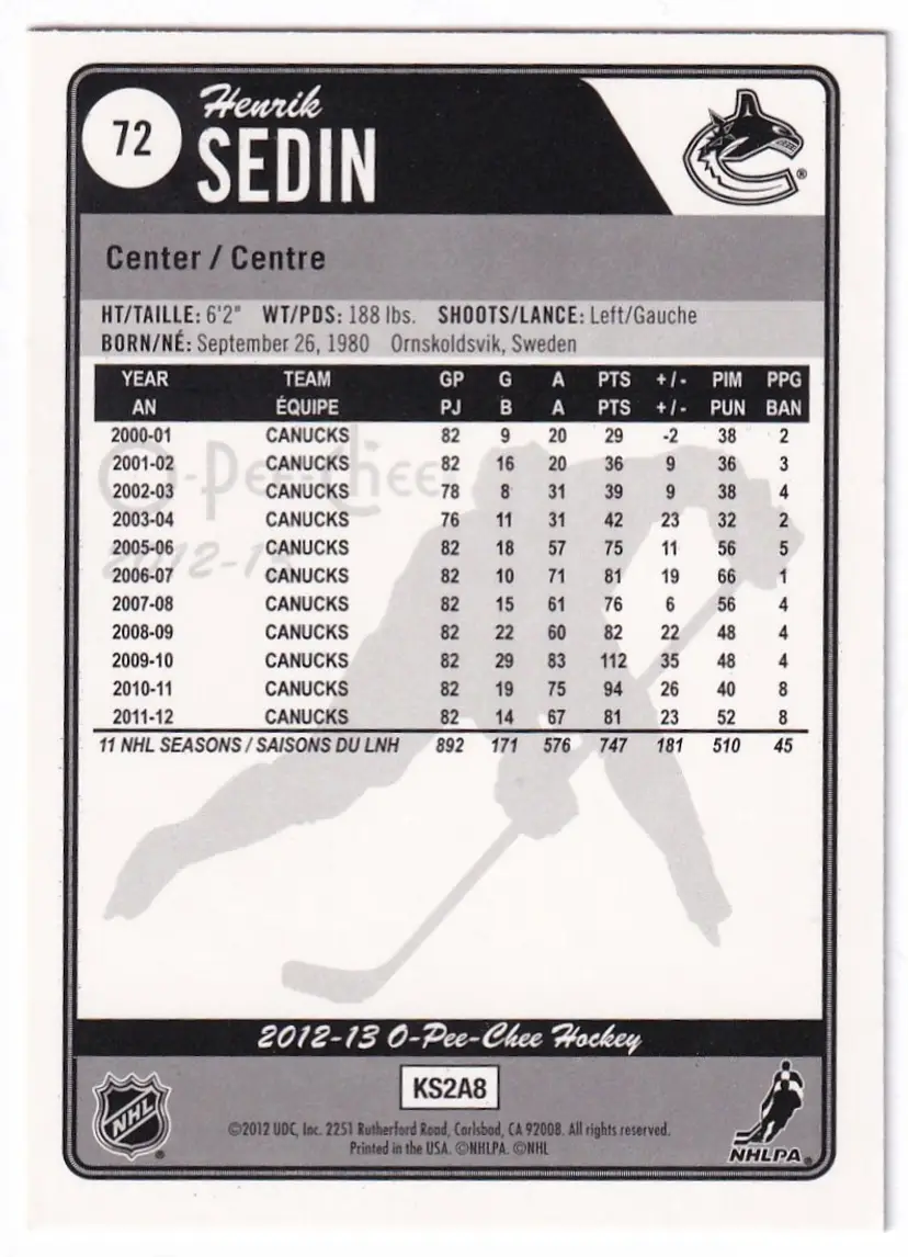 2012-13 O-Pee-Chee Rainbow #72 Henrik Sedin Vancouver Canucks