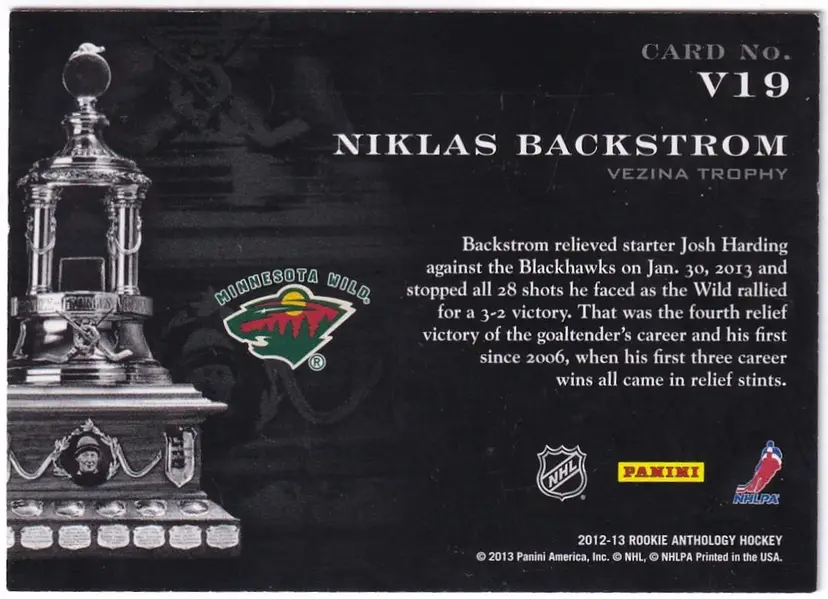 2012-13 Panini Contenders Vezina Contenders #19 Niklas Backstrom Minnesota Wild Print Run - 999