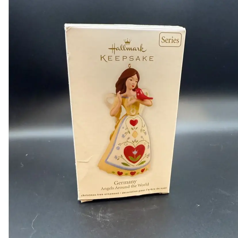 This is the second in the series. This ornament depicts an angel in traditional German attire, wearing a yellow dress with a white apron adorned with red hearts and bluebell flowers. The angel has white wings and is holding a small red cardinal. It is part of the "Angels Around the World" series, which ran from 2011 to 2016, celebrating angels inspired by different countries and cultures. The ornament was designed by artist Katrina Bricker.