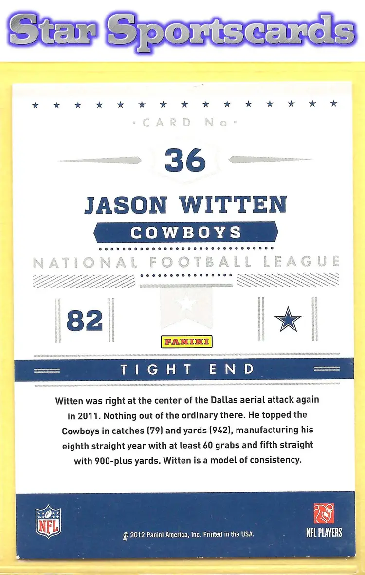 This is a nice example of a 2012 Panini Prestige #36 Jason Witten Stars of the NFL .Other important information about this card: In Jason Witten played for the Dallas Cowboys.Please check out our other listings for more great cards.