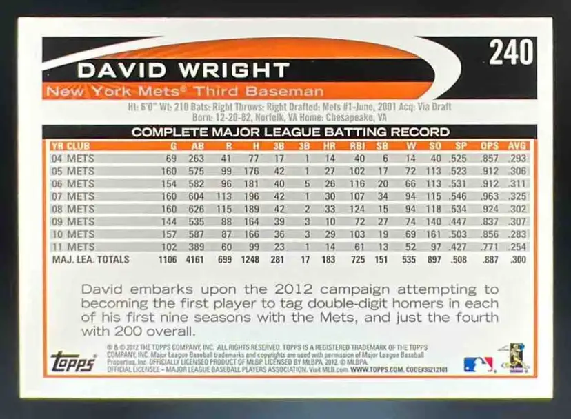 2012 Topps Baseball David Wright Gold Sparkle #240 New York Mets