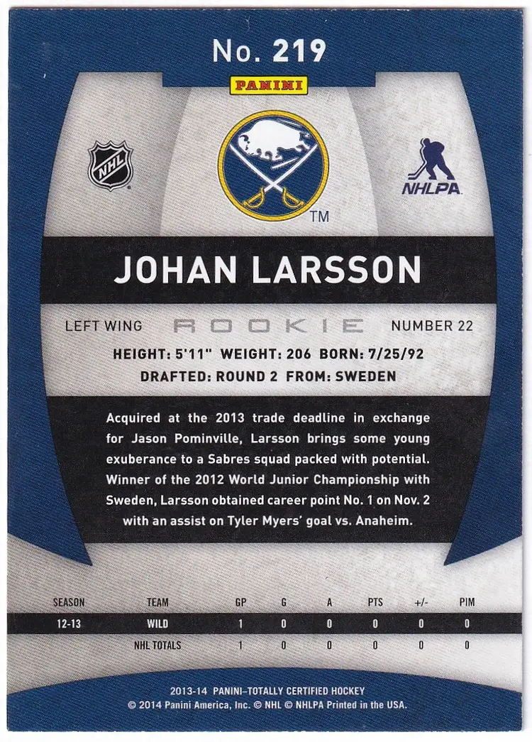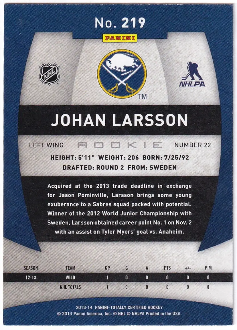 2013-14 Totally Certified #219 Johan Larsson RC Buffalo Sabres