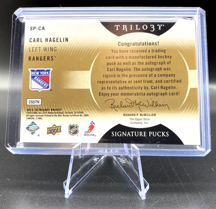 Returns Accepted: ReturnsNotAccepted League: National Hockey League (NHL) Autographed: Yes Set: 2013-14 Upper Deck Trilogy Signed By: Carl Hagelin Autograph Format: Hard Signed Player/Athlete: Carl Hagelin Year Manufactured: 2013 Insert Set: Signature Pucks Vintage: No Type: Sports Trading Card Sport: Ice Hockey Parallel/Variety: Signatures Autograph Authentication: Upper Deck Manufacturer: Upper Deck Team: New York Rangers Card Number: SP-CA Season: 2013-14 Country/Region of Manufacture: United States