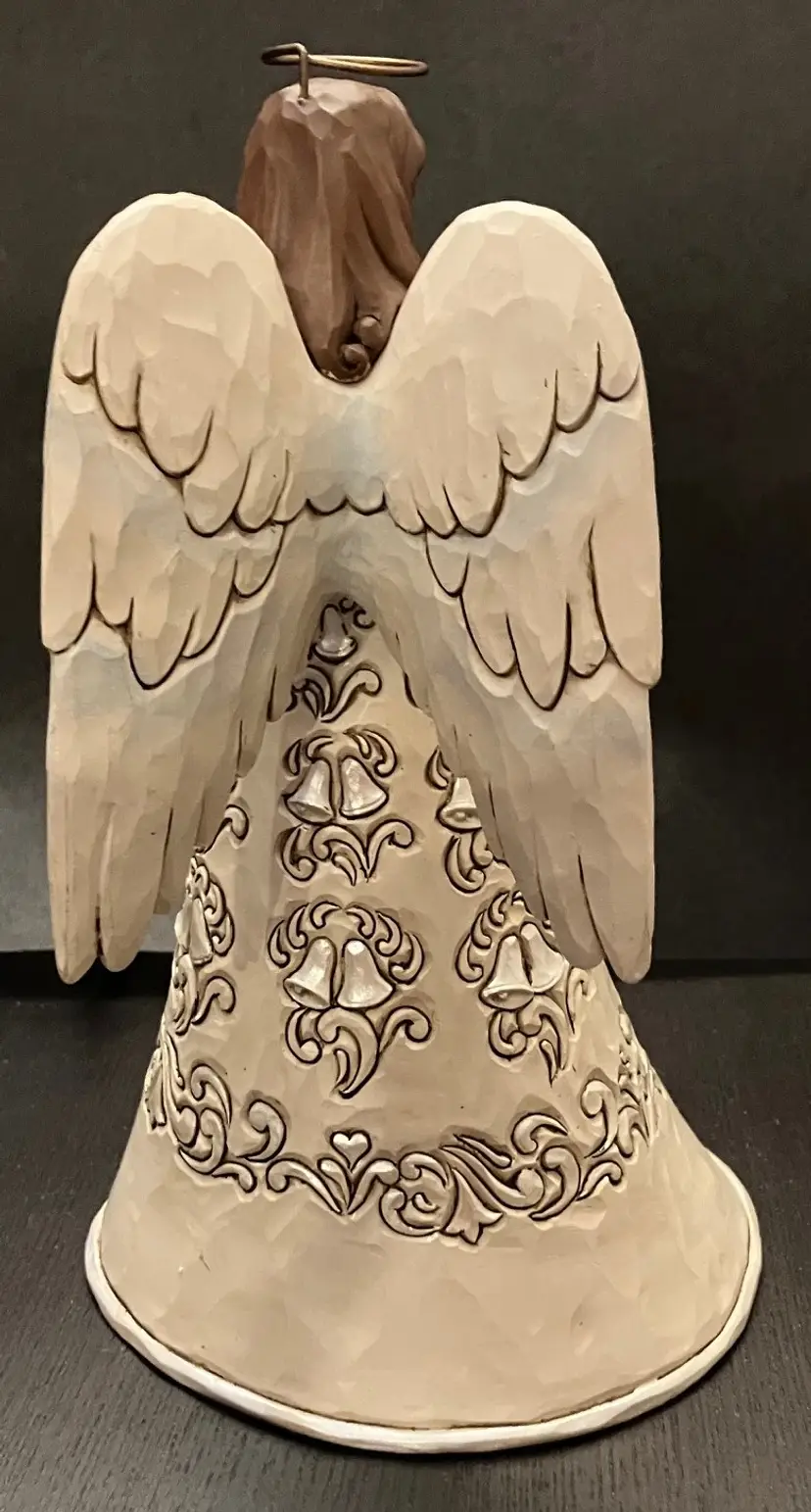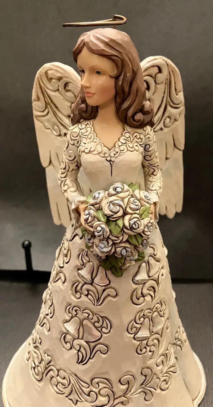 Jim Shore Heartwood Creek "Blessings on Your Anniversary" Angel figurine. Commemorates a wedding anniversary with silver bells and delicate scrollwork. Measures approximately 8 1/2" tall, 4 1/2" diameter at the base. No condition issues.