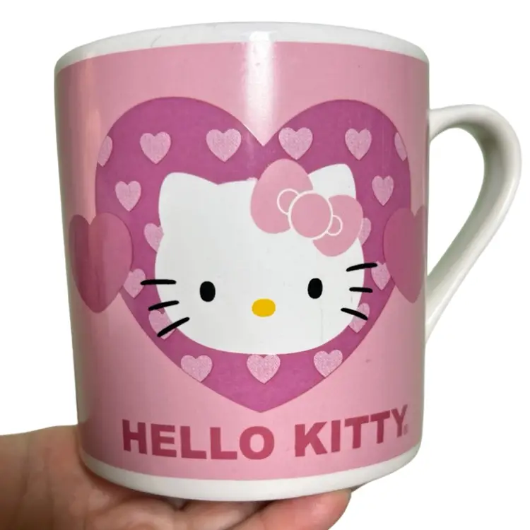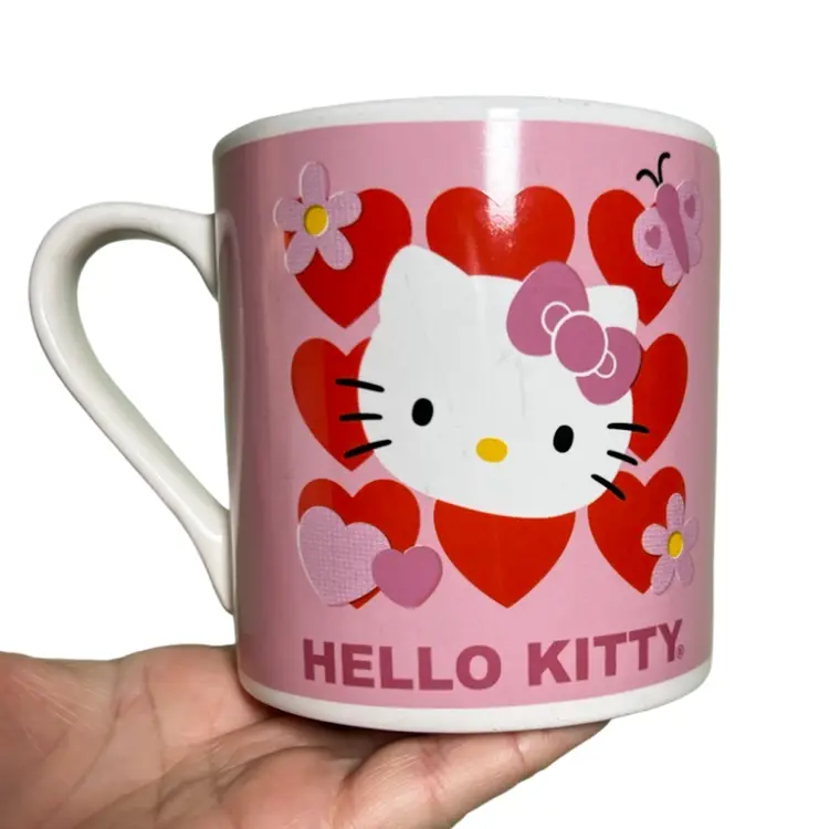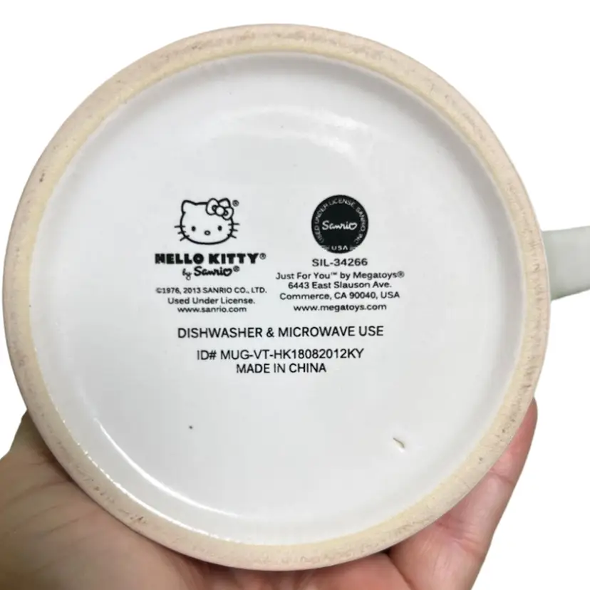 2013 Sanrio ceramic cup mug No chips, no cracks Gray marks in bottom of mug (see photo) Great vivid graphics with minor gray scuffs (last 2 photos) Large mug 4” tall x 4” mouth