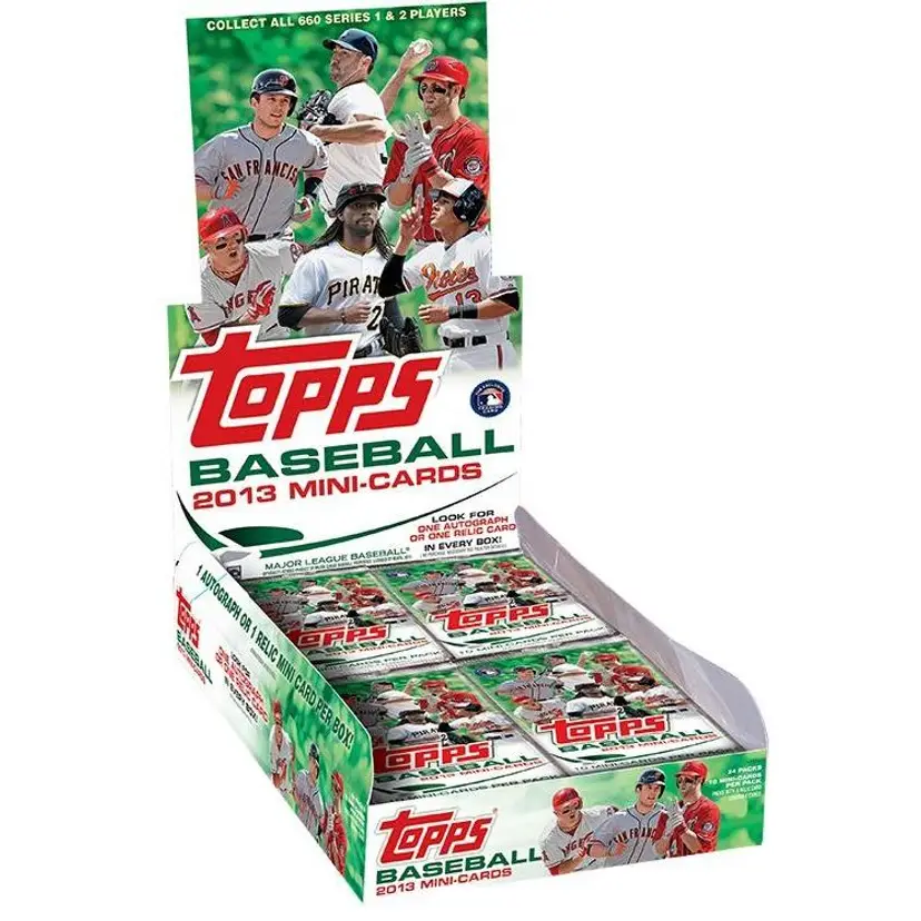 From the sell sheet: Each Box contains Autograph or Relic Card! Hailed as the Best wax at the 2012 National Sports Collectors Convention, the much-anticipated 2013 Topps Mini Baseball cards are now available only from Topps.com! Look for Autographs from today's biggest stars such as Yu Darvish, Mike Trout, Adam Jones, Yasiel Puig, as well as all-time greats Nolan Ryan, Cal Ripken Jr., Sandy Koufax and more!