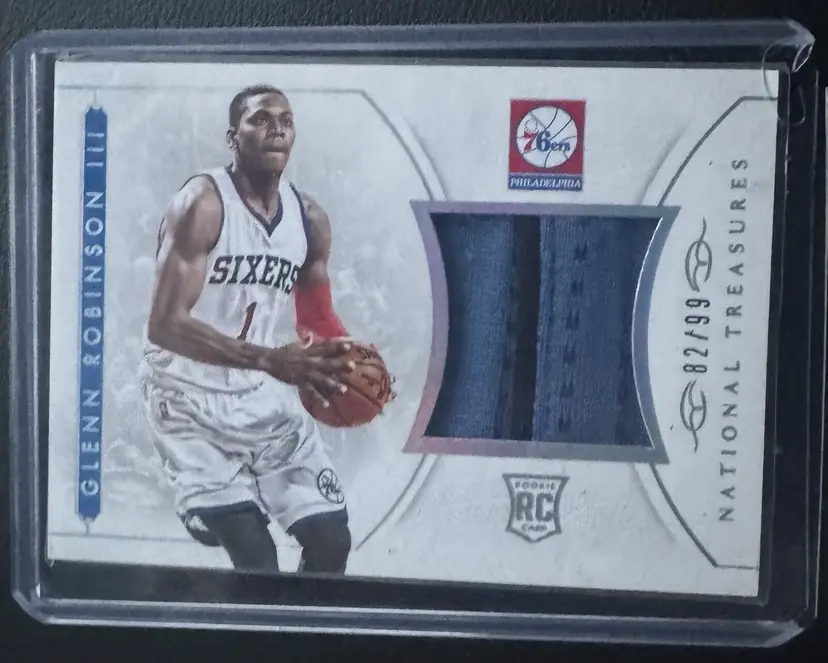 Player: Glenn Robinson III League: National Basketball Association (NBA) Set: 2014-15 Panini National Treasures - NBA Rookie Materials Product: Single-Insert Year Manufactured: 2014 Player/Athlete: Glenn Robinson III Athlete: Glenn Robinson III Franchise: N/A Card Attributes: Memorabilia, Rookie, SerialNumbered Type: Sports Trading Card Sport: Basketball Parallel/Variety: [None] Year: 2014-15 Card Name: Glenn Robinson III Original/Reprint: Original Manufacturer: Panini America, Inc. Team: Philadelphia 76ers Features: Rookie Card Number: RM-GR3 Season: 2014-15 Card Manufacturer: Panini America, Inc.