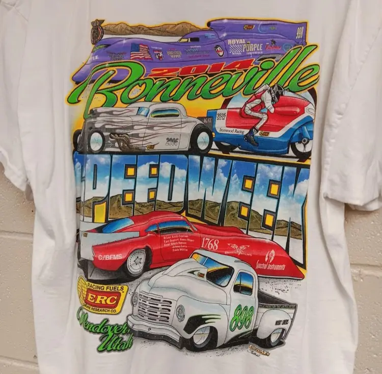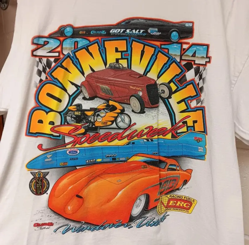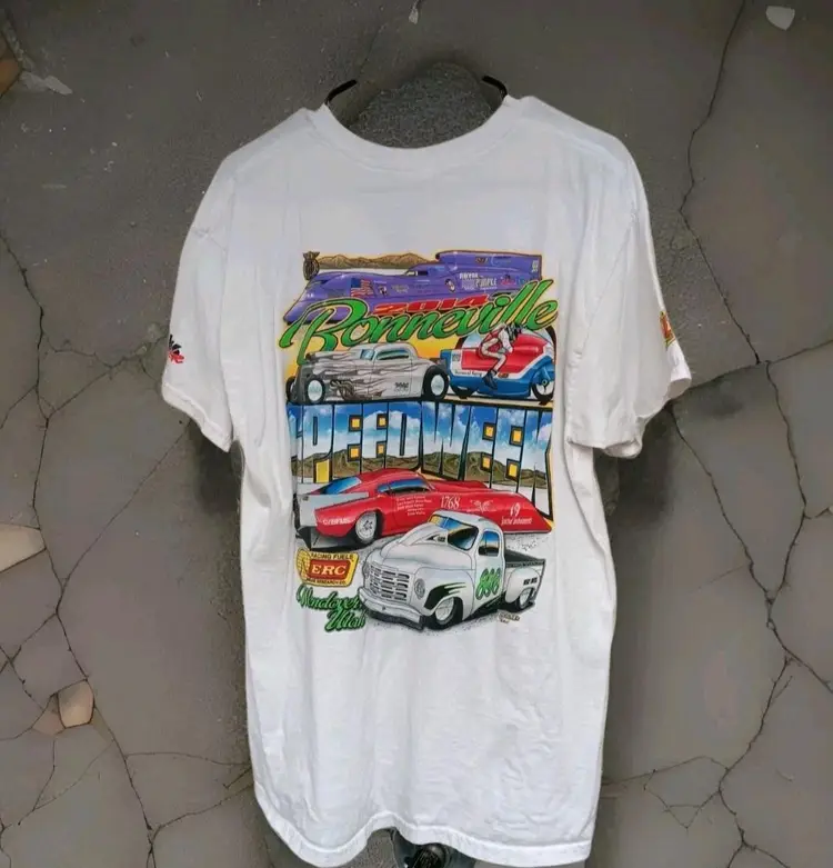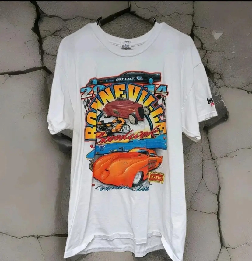 A white Gildan T-shirt in size L, featuring a graphic print related to cars and racing from the 2014 Bonneville Speedweek in Wendover, Utah. The design is double-sided, showcasing a classic racing theme. The shirt has short sleeves, a crew neck, and is made of cotton. It has a regular fit and is suitable for men who appreciate racing culture.