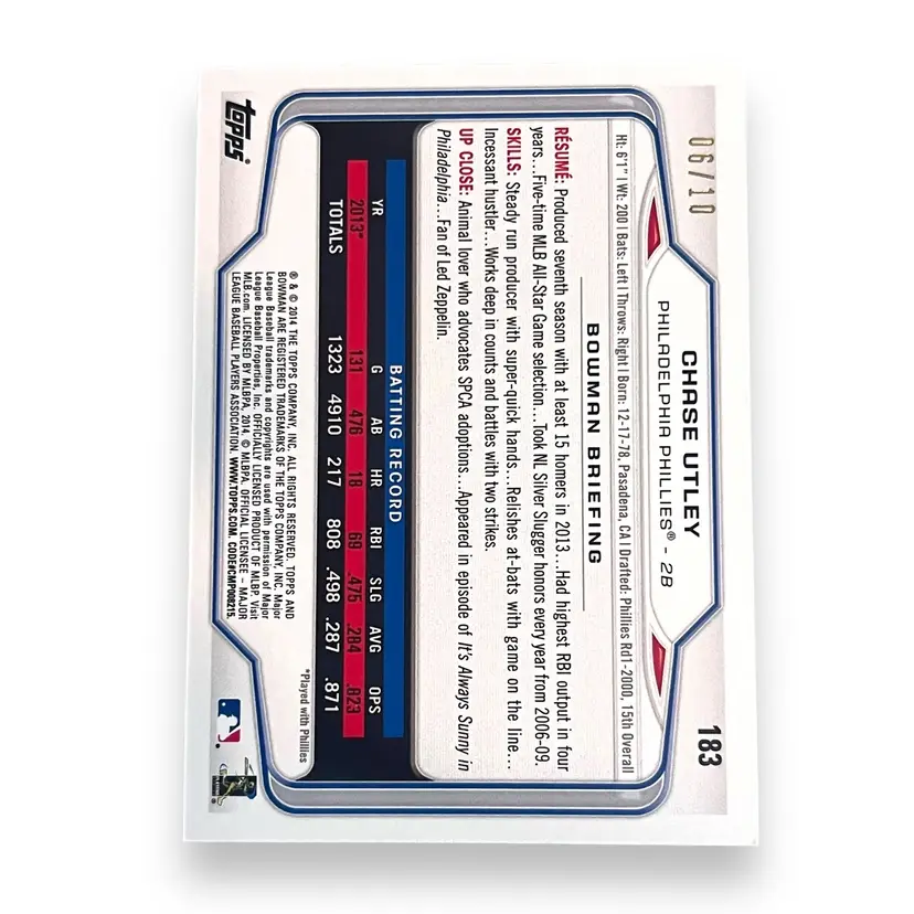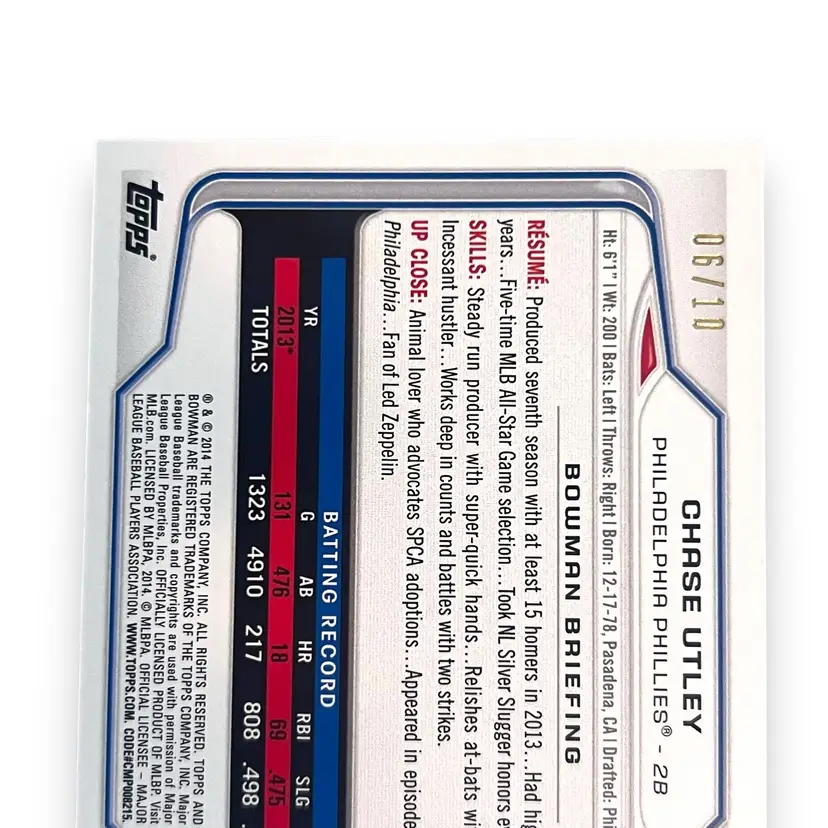 Here We Have a 2014 Bowman Chase Utley Purple Ice 06/10 Philadelphia Phillies