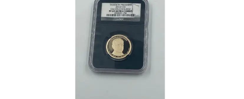 2014-S $1 Calvin Coolidge Dollar - PF69 Ultra Cameo (NGC) Own a piece of presidential history with this 2014-S $1 Calvin Coolidge Dollar, graded PF69 Ultra Cameo by NGC. Part of the Presidential Dollar series, this coin honors Calvin Coolidge, the 30th President of the United States, who served from 1923 to 1929 and was known for his leadership during a period of economic prosperity. Struck at the San Francisco Mint, this proof coin features a stunning design by Don Everhart. The obverse showcases a detailed portrait of President Coolidge, while the reverse displays the Statue of Liberty, symbolizing freedom and democracy. The Ultra Cameo designation highlights the coin's frosted details and mirror-like fields, creating a striking visual contrast. Encased in NGC's protective holder, this coin is preserved in near-perfect condition, ensuring its beauty and authenticity for years to come. Whether you're a seasoned numismatist or a history enthusiast, this 2014-S Calvin Coolidge Dollar is a remarkable addition to any collection. Don't miss the chance to own this exquisite tribute to one of America's presidents