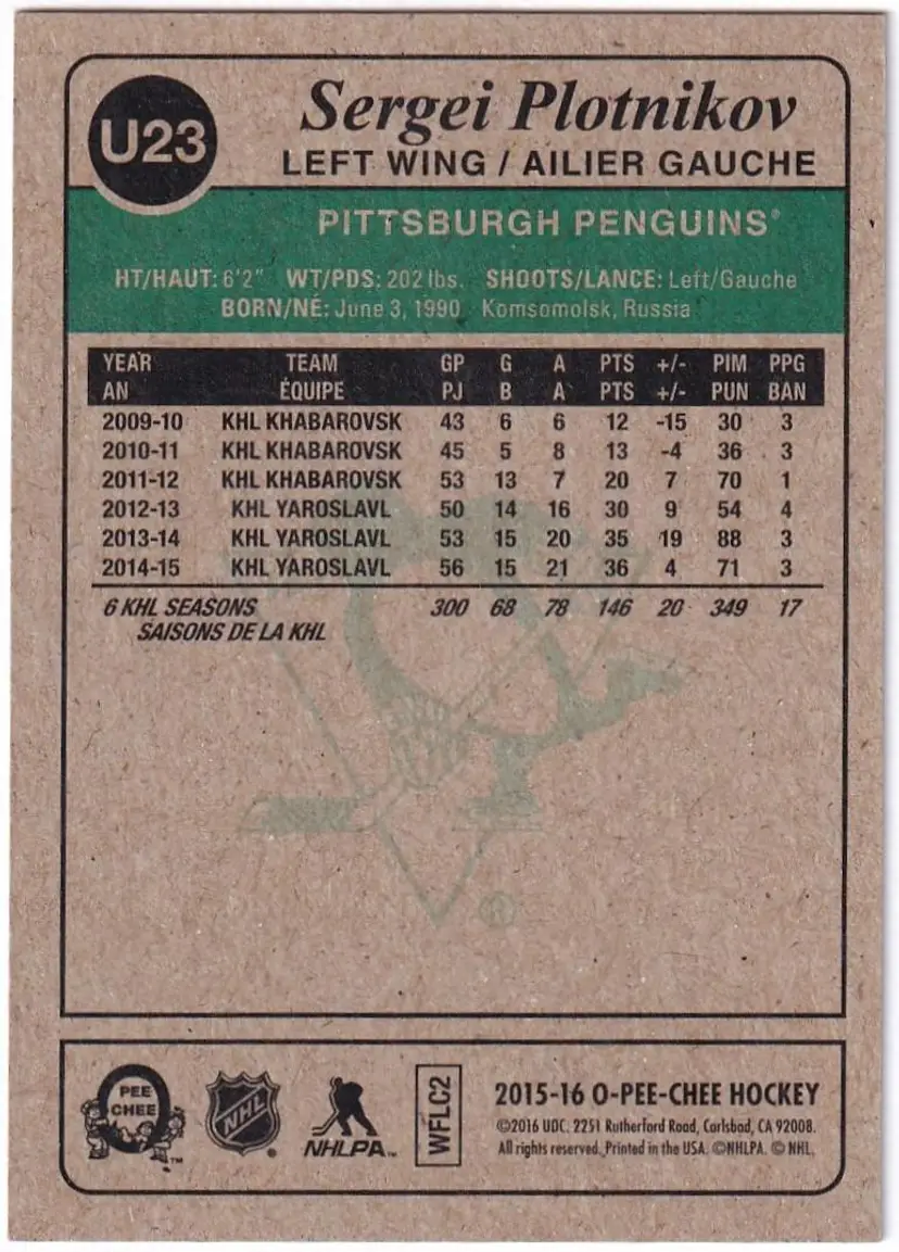 2015-16 O-Pee-Chee Update Retro #U23 Sergei Plotnikov Pittsburgh Penguins