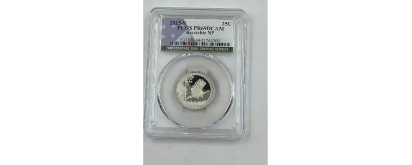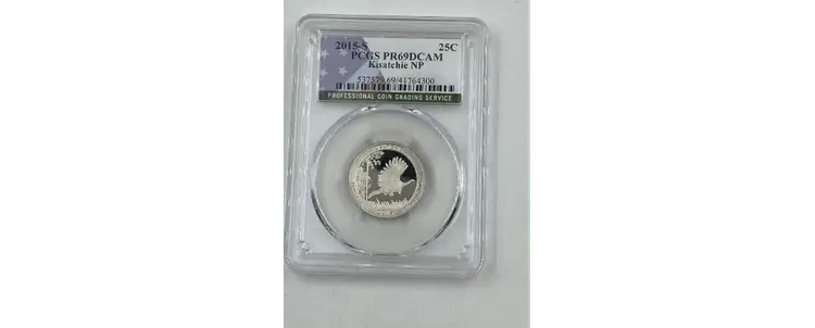 This stunning 2015-S Kisatchie National Park Quarter, struck in 90% silver at the San Francisco Mint, is a remarkable addition to any collection. Graded PR69 Deep Cameo (DCAM) by PCGS, this coin showcases a flawless mirror-like finish and frosted design elements, creating a striking contrast that epitomizes the Deep Cameo designation. Part of the America the Beautiful Quarters series, this coin celebrates the Kisatchie National Forest in Louisiana, featuring a beautifully detailed reverse design of a wild turkey in flight, surrounded by longleaf pine trees. The obverse displays John Flanagan's classic portrait of George Washington, adding historical depth to this modern masterpiece. With its high grade and captivating design, this coin is not only a tribute to the natural beauty of Kisatchie National Forest but also a valuable piece of American numismatic history. Whether you're a seasoned collector or an investor, this 2015-S Kisatchie National Park Quarter offers both rarity and enduring appeal