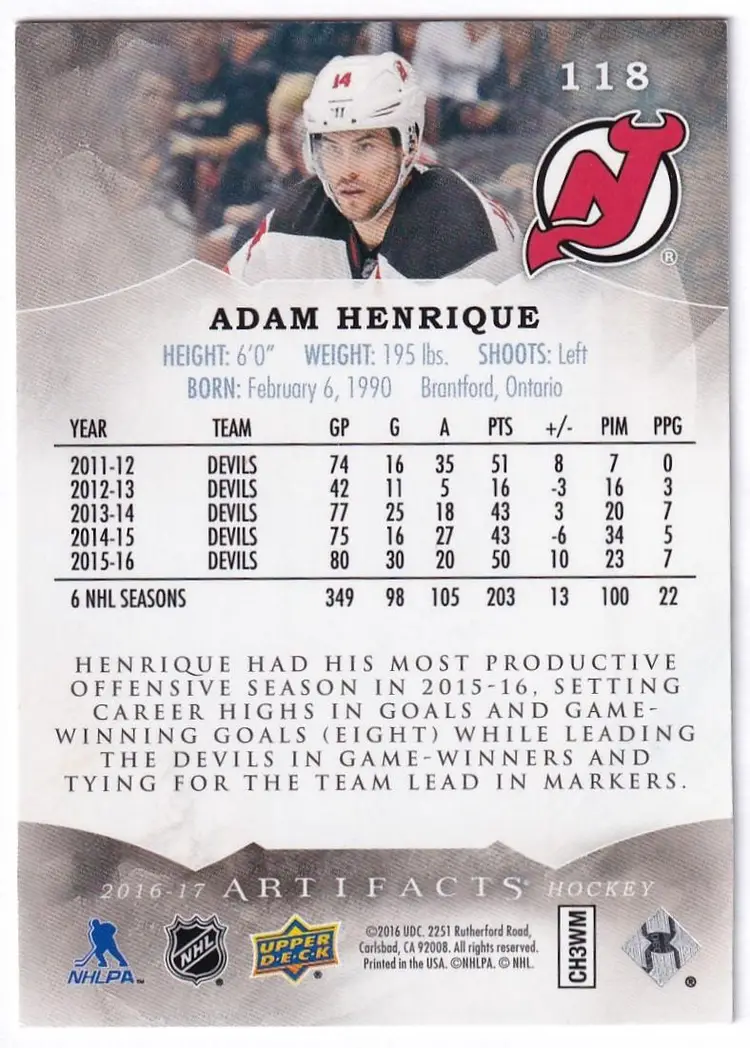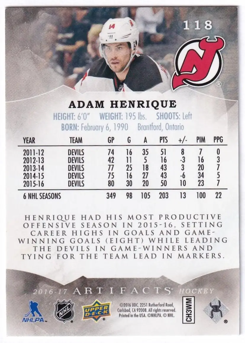 2016-17 Artifacts #118 Adam Henrique New Jersey Devils Print Run - 499