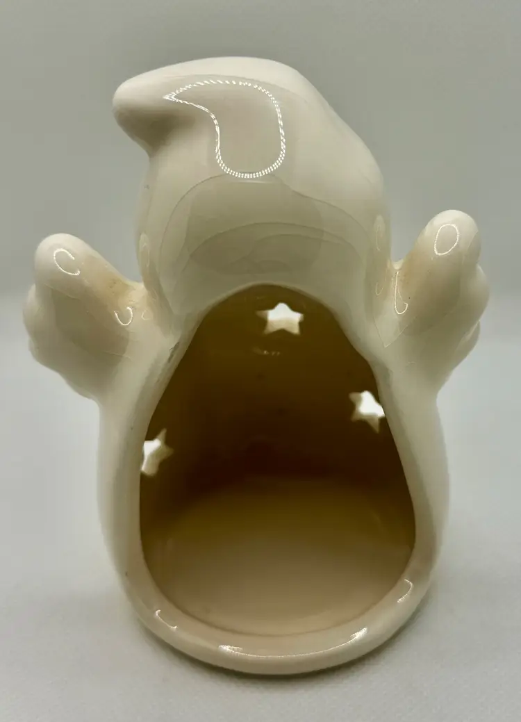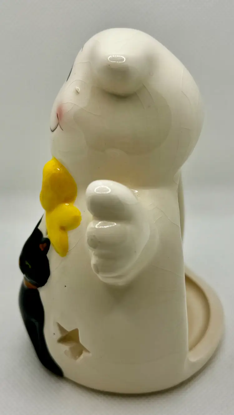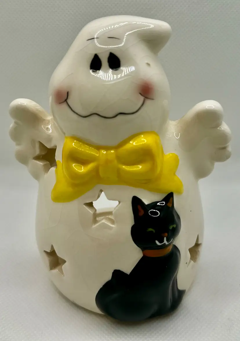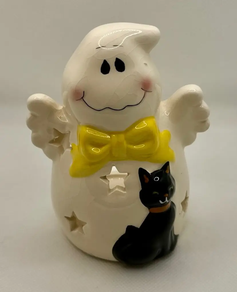 Add a touch of spooky charm to your Halloween decor with this 2016 ceramic ghost tea light votive candle holder. Featuring a friendly ghost with a bright yellow bow tie and a cute black cat, this piece is perfect for creating a warm, festive atmosphere. The star-shaped cutouts allow the candlelight to shine through, casting delightful shadows. Ideal for collectors or as a unique seasonal decoration. Excellent condition with no chips or cracks. Measures 3.5x5x3 inches. Weighs 6oz.