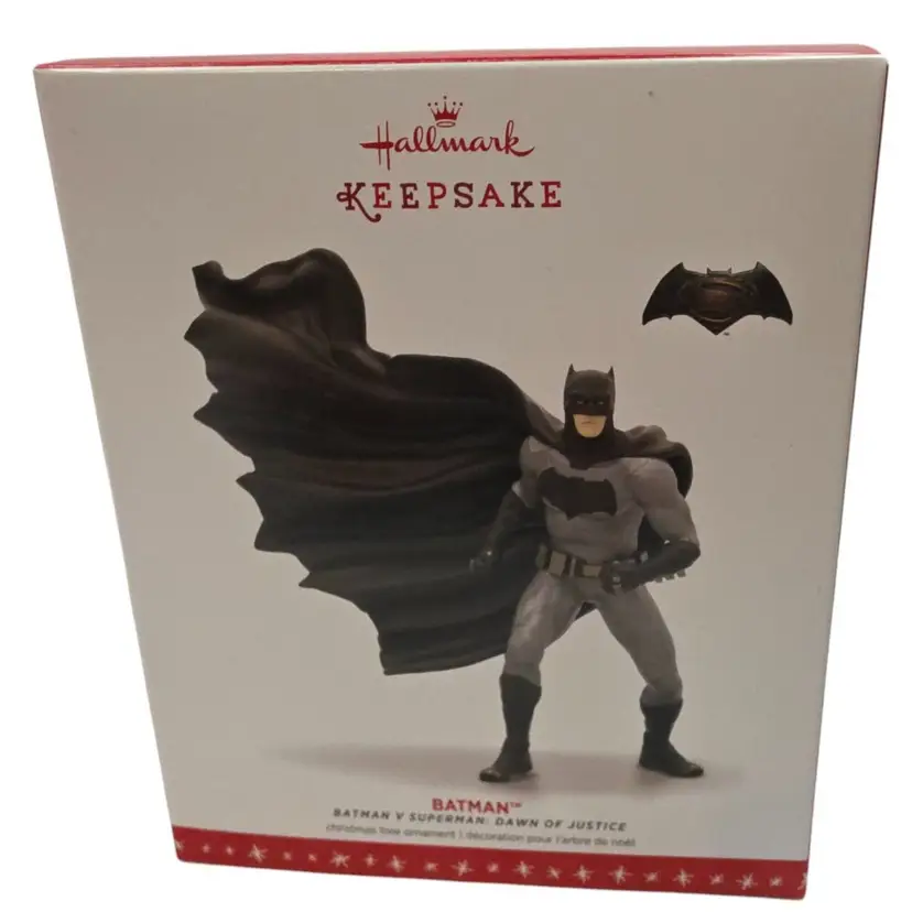 Celebrate the heroics of one of DC Comics' most iconic characters with this Hallmark Keepsake Ornament from the 2016 Batman V Superman: Dawn of Justice series. Featuring a dramatically sculpted Batman clad in his grey suit and black cape, this ornament perfectly captures the essence of the Dark Knight as seen in the film - He's a millionaire philanthropist by day and heroic crime fighter by night.. Designed for display, it includes a detachable base and can be combined with other characters from this collection for a larger centerpiece.