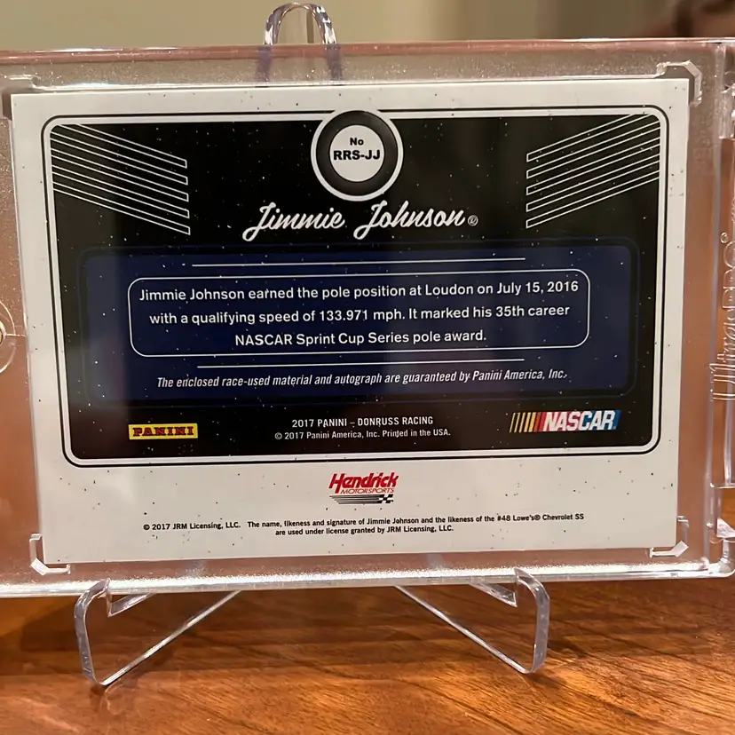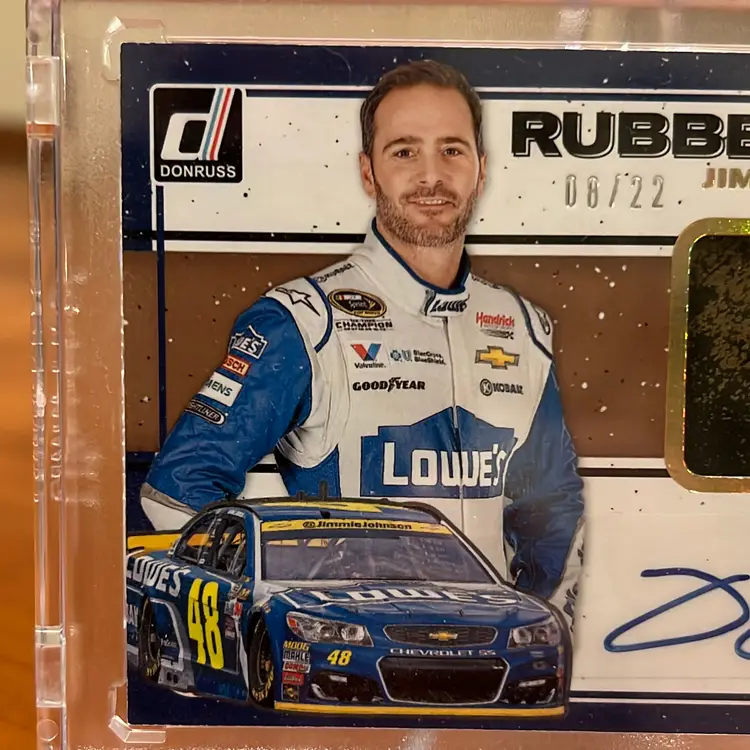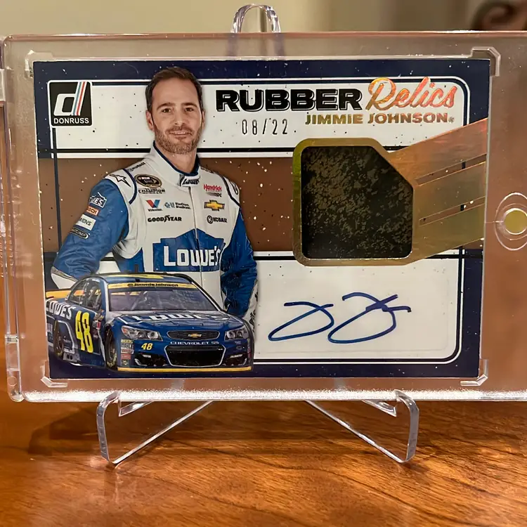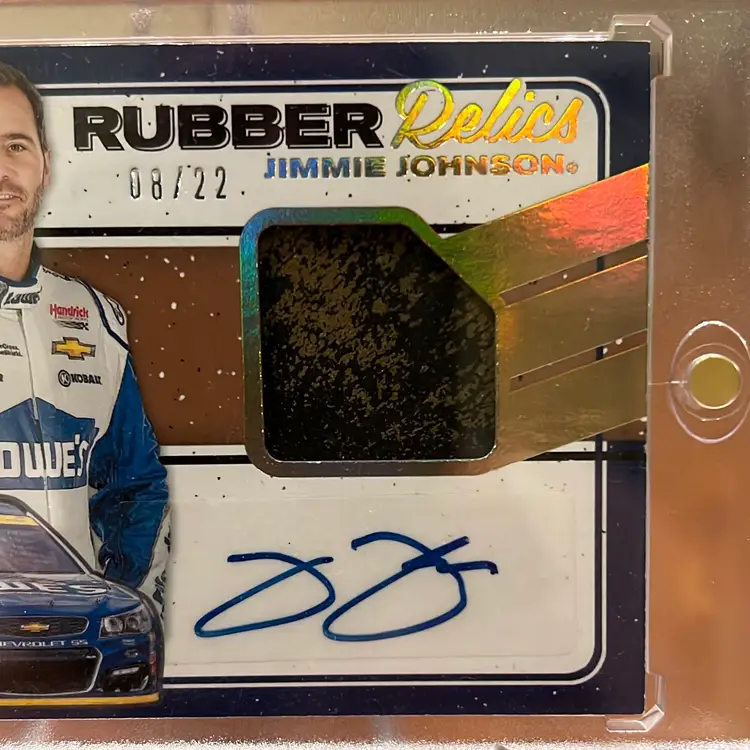 2017 Donruss Jimmie Johnson 8/22 Auto Raced Used Tire Rubber Relics Card No. RRS-JJ