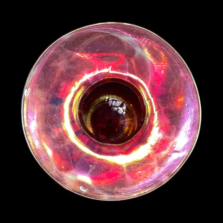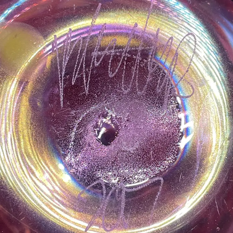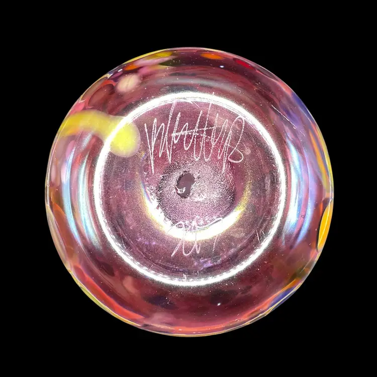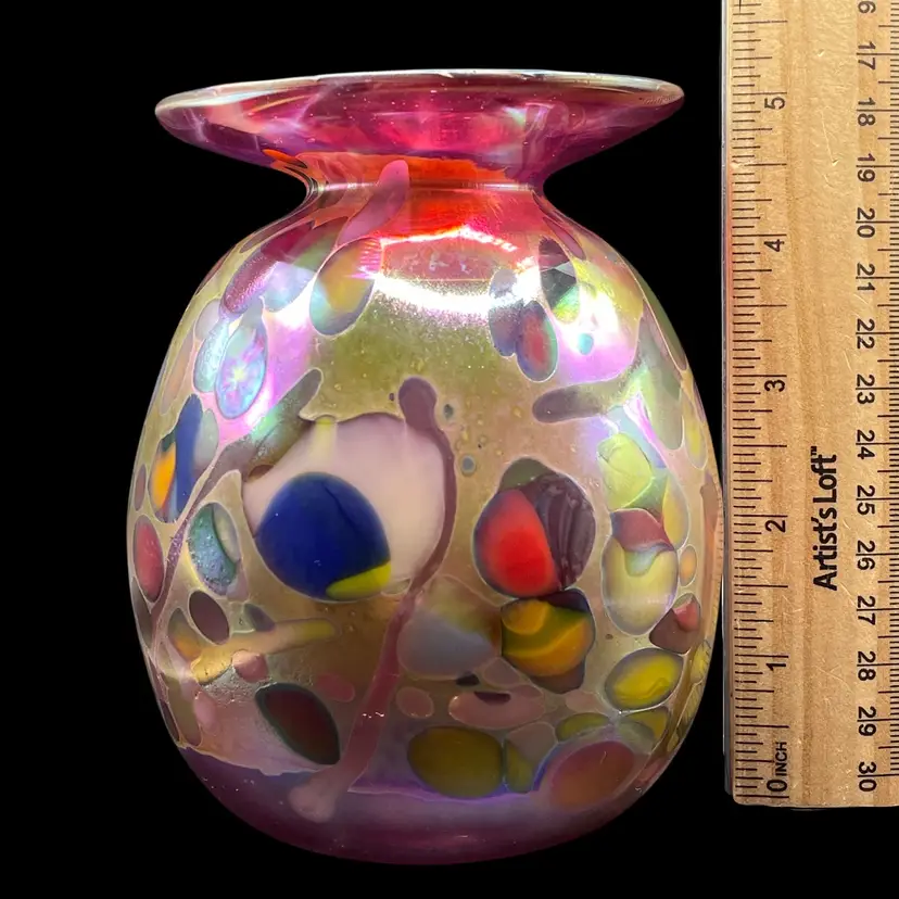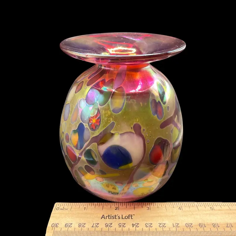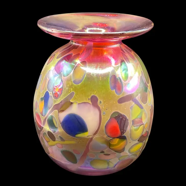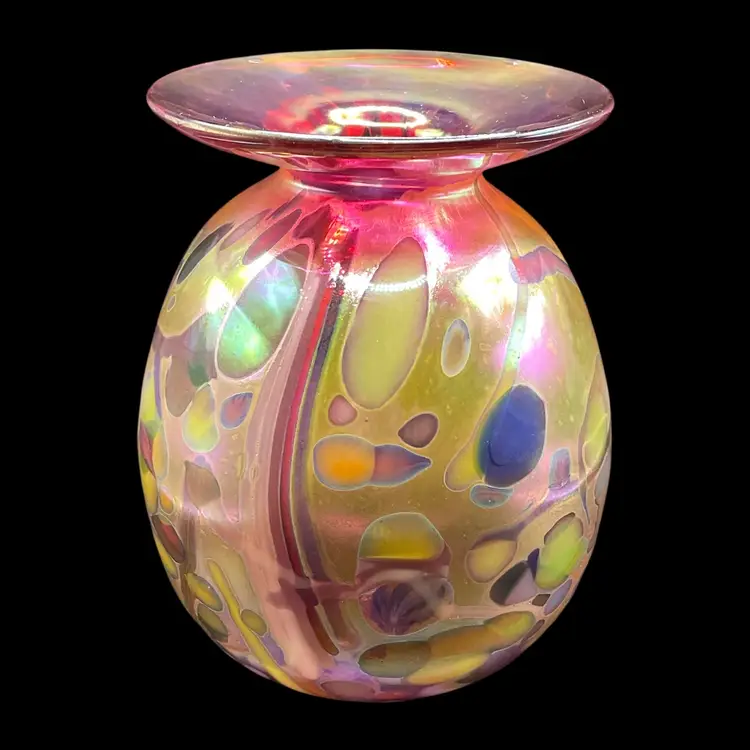The 2017 Rick Hunter Art Glass vase is a modern and abstract piece hand-blown in iridescent multicolor glass. Signed by the artist, this small vase is perfect for all occasions and is handmade in California, USA. With a unique and contemporary style, this decorative collectible is a beautiful addition to any space. The 21st-century design and production techniques used by Rick Hunter Art Glass make this vase a standout piece for collectors and art enthusiasts alike.