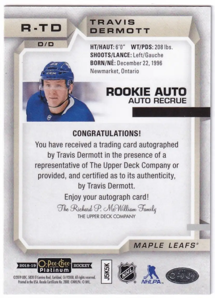 2018-19 O-Pee-Chee Platinum Rookie Autographs #RTD Travis Dermott Toronto Maple Leafs