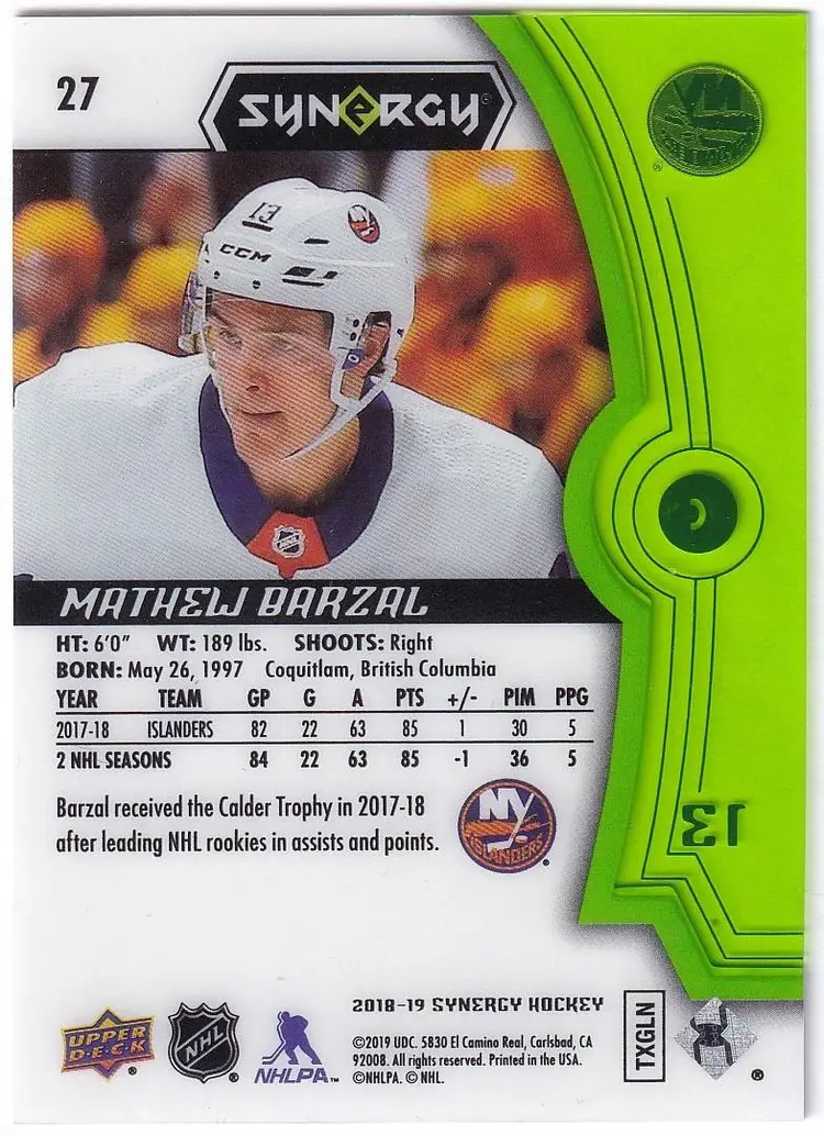 2018-19 Synergy Green #27 Mathew Barzal New York Islanders