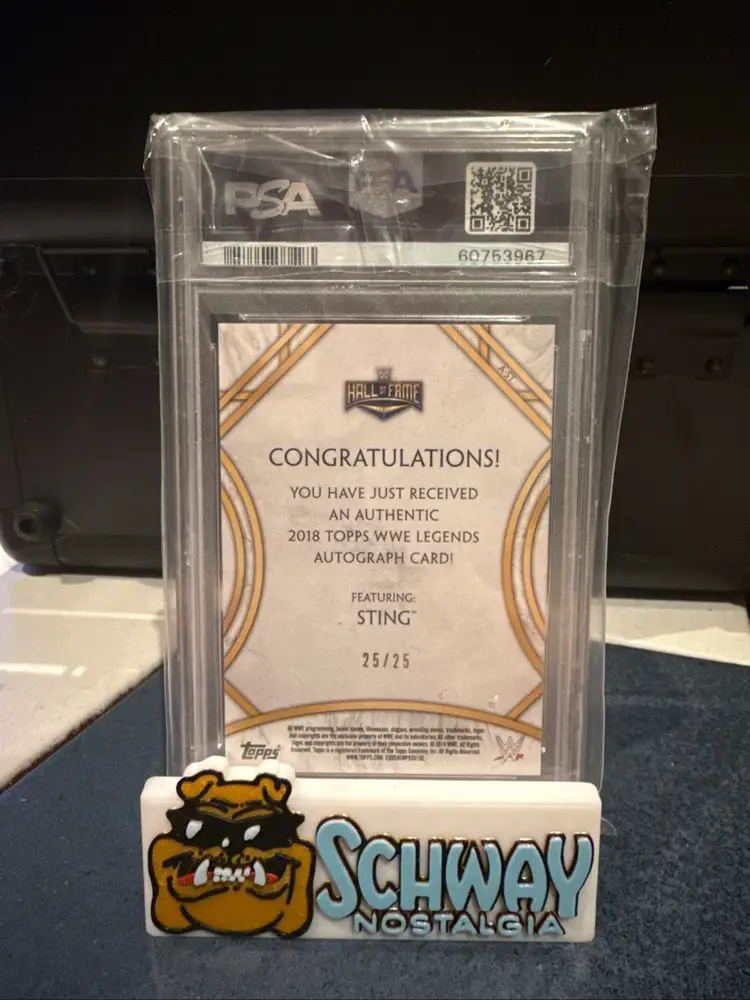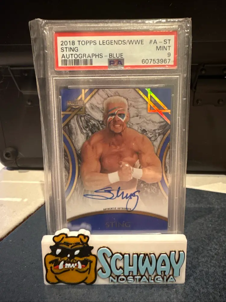 The product is a highly collectible 2018 Topps Legends WWE Sting Blue trading card, featuring an autograph from the wrestler himself. This limited edition card is numbered out of 25 and has been authenticated by Topps. It is a valuable addition to any sports trading card collection, especially for fans of wrestling and the WWE league. The card is hard-signed, making it a rare and desirable item for collectors looking for unique pieces signed by famous athletes.