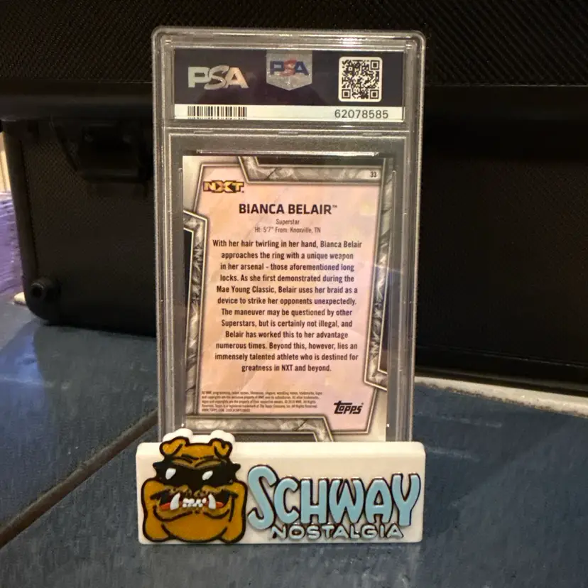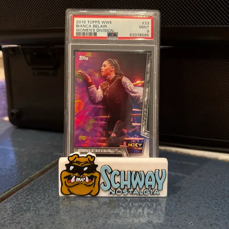 The product is a 2018 Topps WWE Women's Division 33 Bianca Belair NXT RC ROOKIE CARD PSA 9. This sports trading card features wrestler Bianca Belair as a rookie in the WWE Women's Division, part of the 2018 set manufactured by Topps. The card is made of standard card stock material and is an original licensed reprint, perfect for fans and collectors of wrestling memorabilia. This modern-era card showcases the sport of wrestling and is a valuable addition to any trading card collection.