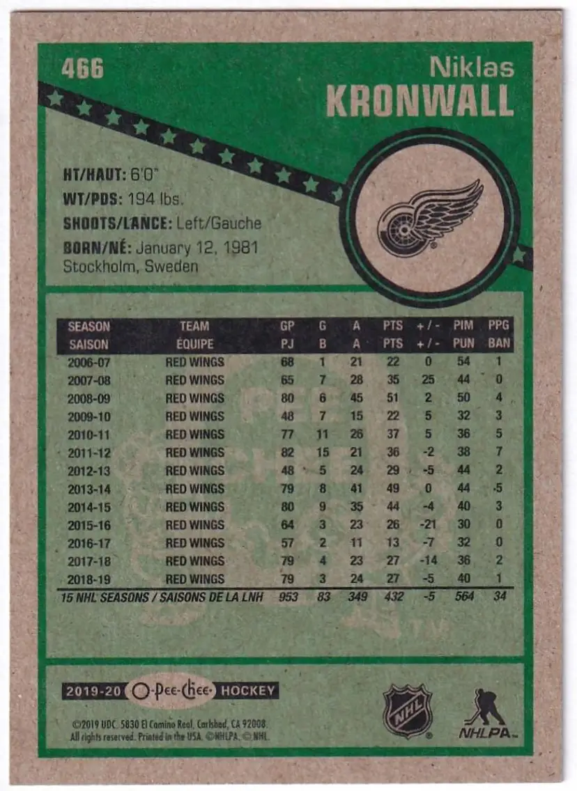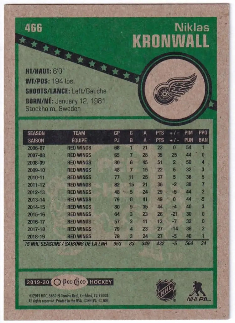 2019-20 O-Pee-Chee Retro #466 Niklas Kronwall Detroit Red Wings