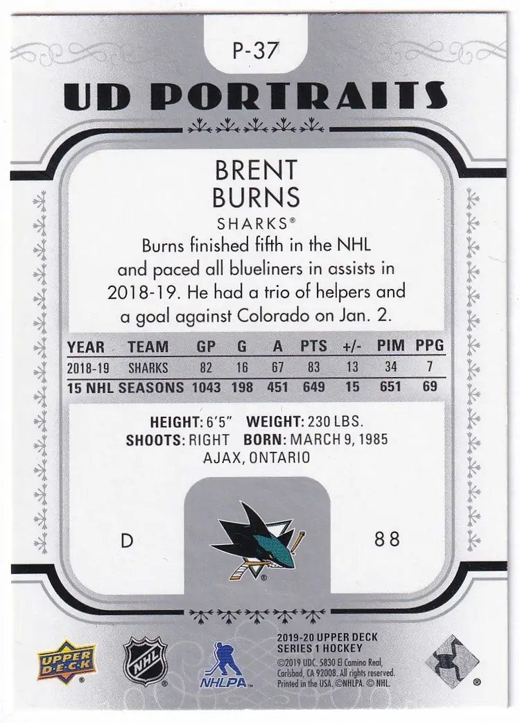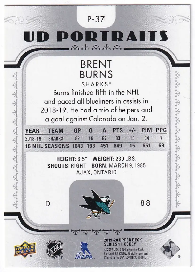 2019-20 Upper Deck UD Portraits #P37 Brent Burns San Jose Sharks