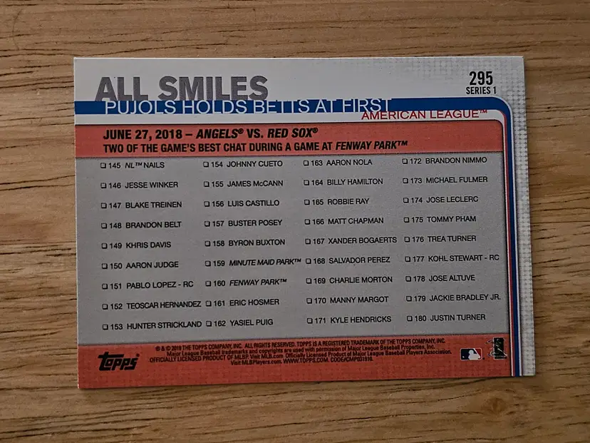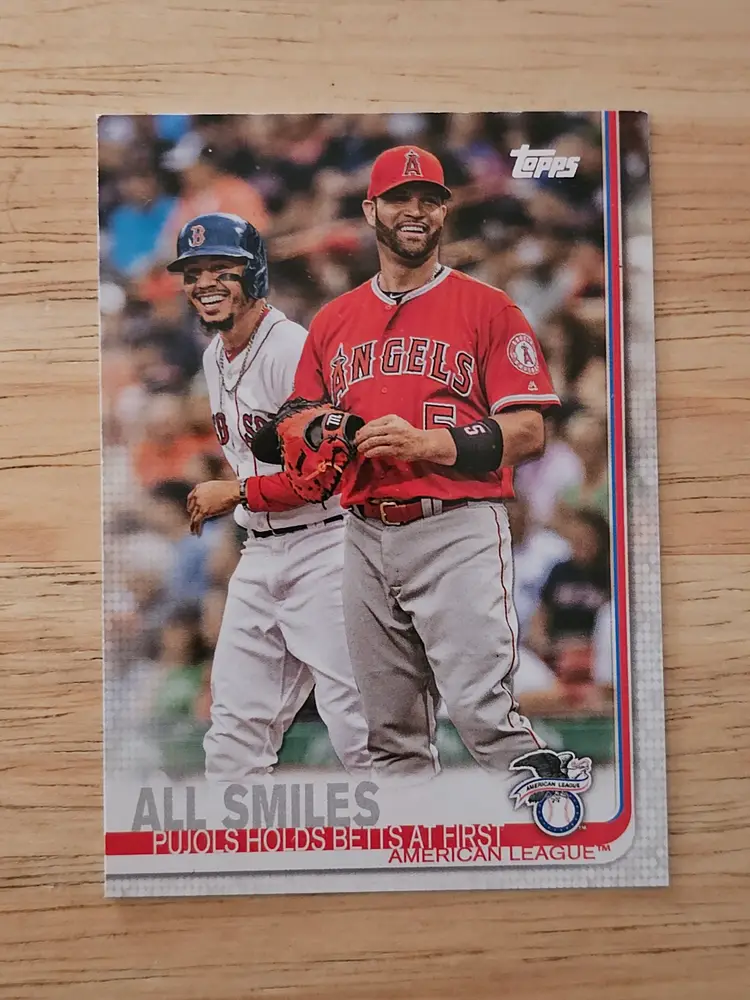 2019 Topps Series 1 Baseball All Smiles Albert Pujols Mookie Betts Los Angeles Angels Los Angeles Angels Boston Red Sox Card #295.